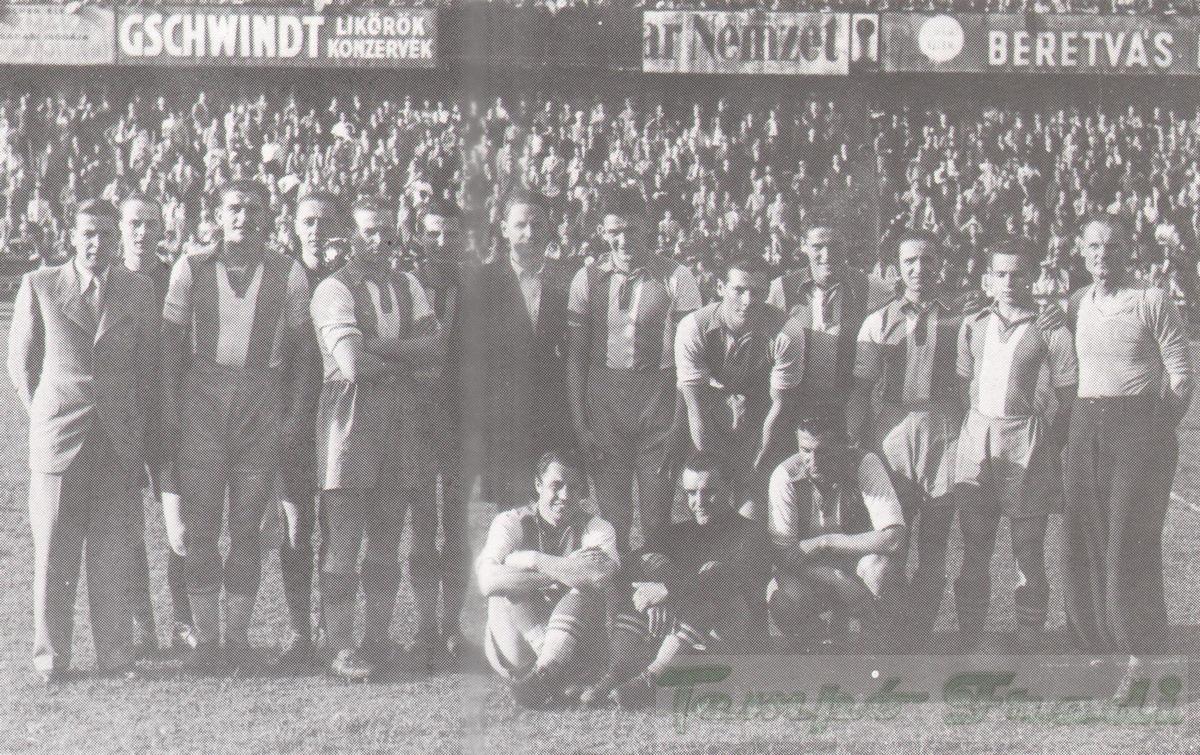Állnak (balról): Dimény Lajos edző, Kiszely, Polgár, Pósa, Biró, Sárosi III., Gyetvai, Kiss Gy., Nagy II., Pauer gyúró. Elől: Szoyka dr., Csikós, Sárosi I.