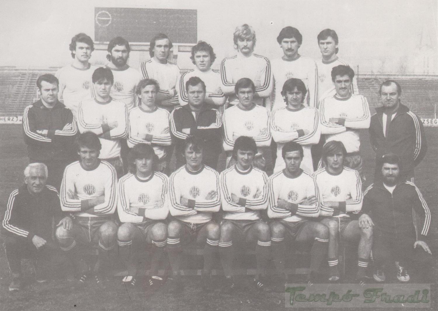 Állnak (balról): Horváth R., Judik, Kakas, Hajdú J., Zsiborás, Szepessy, Mészöly P. Középen: Szűcs Lajos pályaedző, Tepszics, Jancsika, Novák Dezső vezetőedző, Mucha, Major, Mörtel, Monostori Tivadar pályaedző. Elől: Takács József gyúró, Nyilasi, Ebedli Z., Szokolai, Pogány, Takács L., Murai.