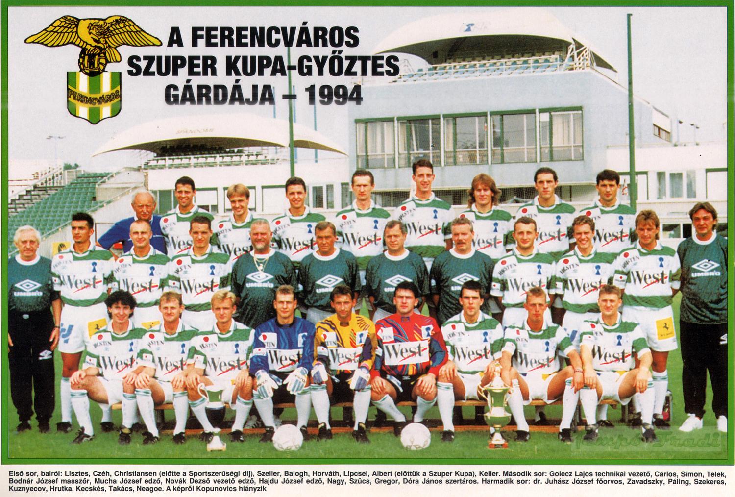 Középen: Golecz Lajos technikai vezető, Carlos, Simon, Telek, Bodnár József masszőr, Mucha József edző, Novák Dezső vezetőedző, Hajdú József edző, Nagy Zs., Szűcs M., Gregor J., Dóra János szertáros.