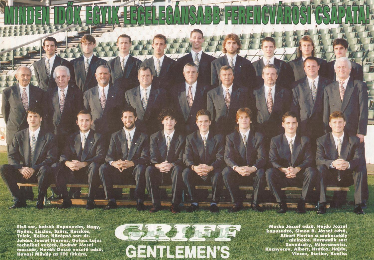 Harmadik sor, balról: Zavadszky, Milovanovic, Kuznyecov, ifj. Albert, Hrutka, Hajdú A., Vincze O., Szeiler, Kuntic. Középen: dr. Juhász József orvos, Golecz Lajos technikai vezető, Bodnár József masszőr, Novák Dezső vezetőedző, Havasi Mihály titkár, Mucha József edző, Hajdú József kapusedző, Simon Balla István edző, Albert Flórián szakosztály-elnök. Elől: Kopunovic, Nagy Zs., Nyilas, Lisztes, Szűcs M., Kecskés, Telek, Keller.
