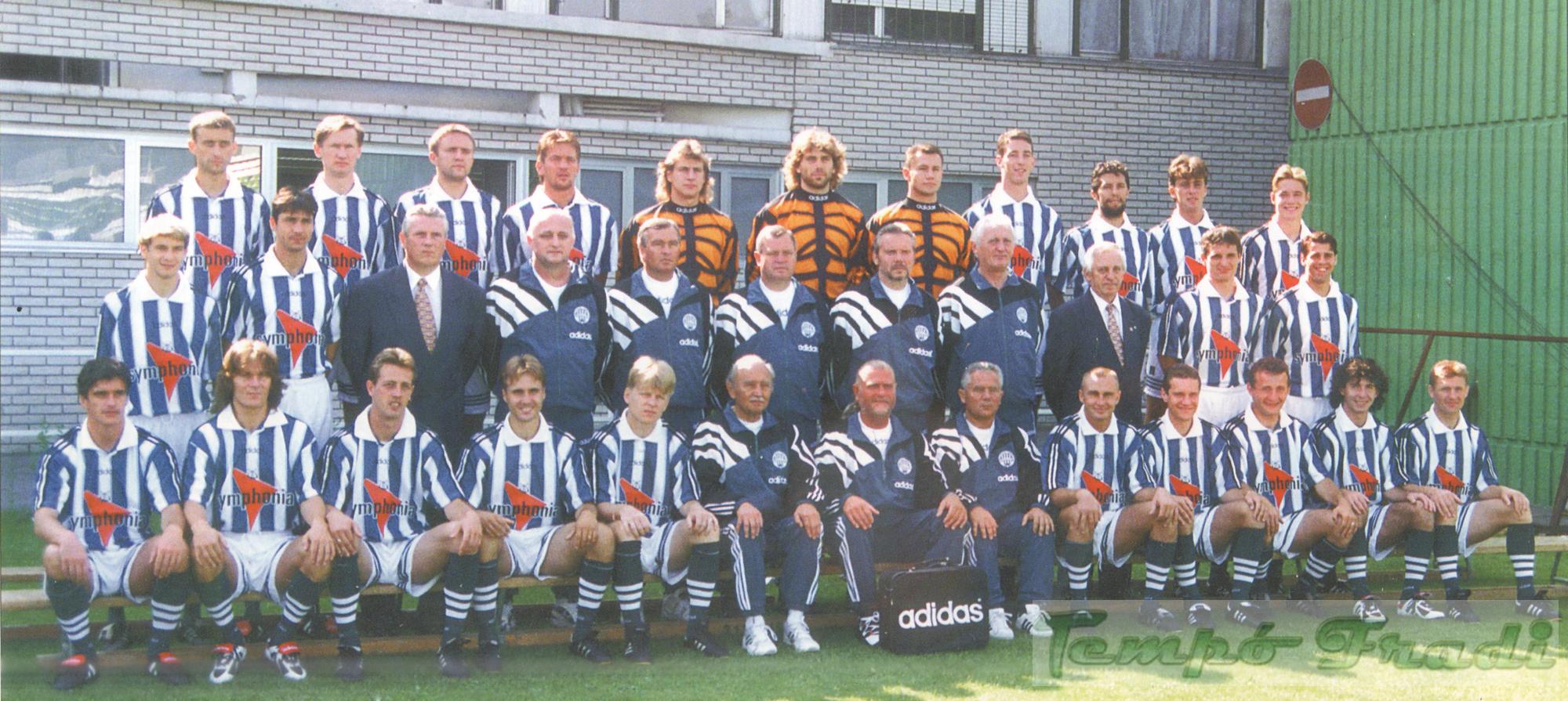 Harmadik sor, balról: Milovanovic, Kuznyecov, Arany, Jagodics, Szeiler, Hajdú A., Tí­már J., Hrutka, Nyilas, Nagy N., Vincze O. Középen: Schultz, Kopunovic, Havasi szakosztály manager, Szőke II. szertáros, Mucha edző, Novák vezetőedző, Hajdú J. kapusedző, Albert szakosztály-alelnök, Golecz technikai vezető, Telek, Zavadszky. Elől: Kuntic, Kecskés, ifj. Albert, Páling, Nicsenko, dr. Juhász orvos, Bodnár masszőr, dr. Gyarmati orvos, Simon T., Szűcs M., Nagy Zs., Lisztes, Keller