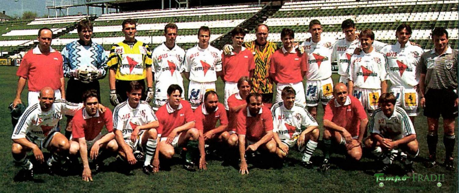 Állnak (balról): Udvarácz, ifj. Albert, Szeiler, Hrutka, Zavadszky, Páling, Horváth F., Vad játékvezető. Elől: Miriuta, Rácz, Schultz, Varga Z.