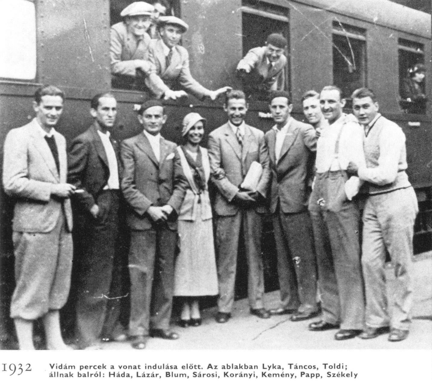 A vonat ablakában sapkában: Lyka II., Táncos. A másik ablakban: Toldi. A vonat előtt állnak (balról): Háda, Lázár, Blum, Sárosi, Korányi, Kemény T., Papp, Székely.