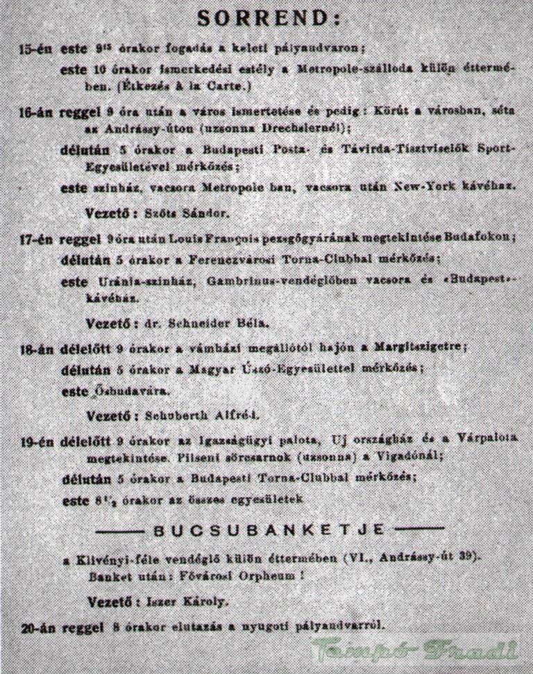 Holnap délután a dánok a Ferencvárosi Torna-Klub-bal játszanak, melynek csapatösszeállitása a következő lesz: Procsko kapuvédő, Berán és Schwartz hátvédő, Kolhanek, Gorszky és Bródy elővédő, Braun, Feketeházy, Pokorny, Kovács és Borbás csatázó. Biró: Scharfe János (B. T. C.)