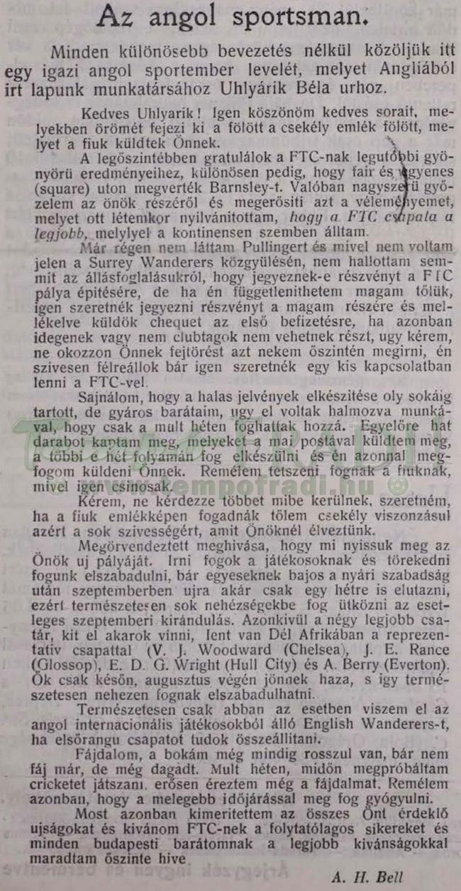 Angol pénz — magyar sportpályára. A Ferencvárosi Torna Clubot kedves meglepetés érte tegnap — Angliából. A. H. Bell, a husvétkor itt járt Surrey Wanderers kitűnő back-je egy nagyon érdekes levélben, melyet hétfői számunkban közölni fogunk, bejelenti, hogy a FTC. uj pályájának részvényeire jegyezni óhajt, sőt mindjárt leveléhez mellékelte az első befizetésre szóló csekket. Amint leveléből kivesszük, a Surrey Wanderers F. C. szintén jegyezni fog. (…)
