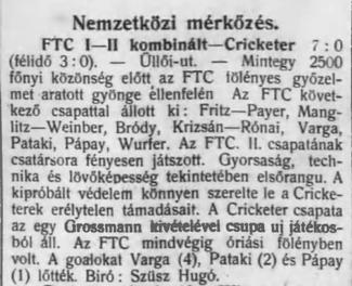 Nemzetközi mérkőzések: FTC I—II. kombinált—Cricketer 7:0 (3:0). Üllői-ut. Mintegy 2500 főnyi közönség előtt az FTC fölényes győzelmet aratott gyenge ellenfelén.