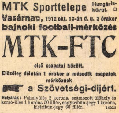 1912. október 13., 15:00, Hungária körút, MTK – FTC 2:2 (0:0)