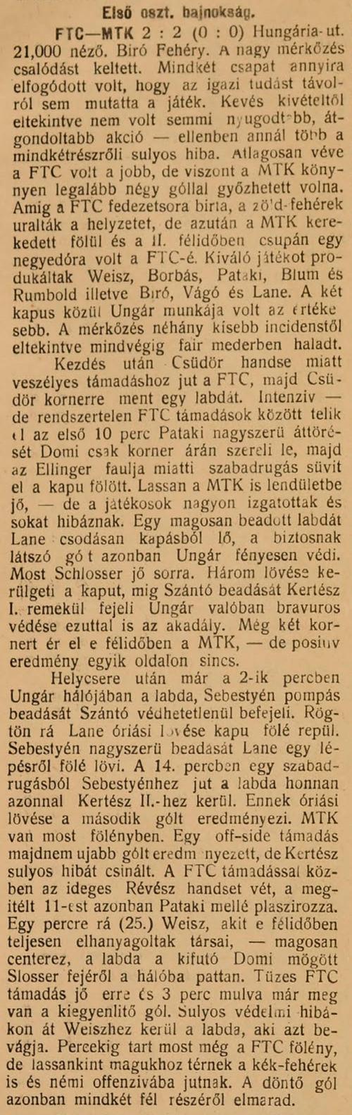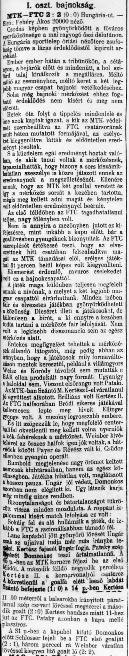 Az első félidőben az állandó jellegű FTC fölényből az MTK csak szórványosan, de mindig veszélyesen tud kiszabadulni és e félidő eredménytelensége a védelmek óvatos, a csatárok elfogult és a szerencse változatos játékán múlott. A második félidőben a „vak“ szerencse a MTK mellé szegődik akkor, amikor a kapu oszlopba kapaszkodó csatár offsidjét a biró nem látja és tiltakozás dacára megadja a gólt, melyet Kertész II. gyönyörű hosszú driver-jéből származó gól követett, melyet Ungár nem védhetett. Az egy félre lőtt 11-től is deprimált FTC játékosok az eredményt megelégelő és a tempót csökkentő MTK hanyatló energiáját látva a mérkőzés utolsó 15 percében uj erőre kapva, vehemens ostrom alá veszik az MTK kaput és 3 perc alatt két gólt lőve, eldöntetlenné teszik a FTC színekért aggódó nézők előtt a már vigasztalanul elveszettnek hitt mérkőzést. Ami ezután következett, az egyszerűen leírhatatlan, a lenyűgözött szenvedélyek és elfojtott izgalmak alól felszabadult nézők ezrei nem ismerve határt az öröm nyilvánításban és mérkőzés után a pályára tódulva ünnepelték a legnépszerűbb színek viselőit.