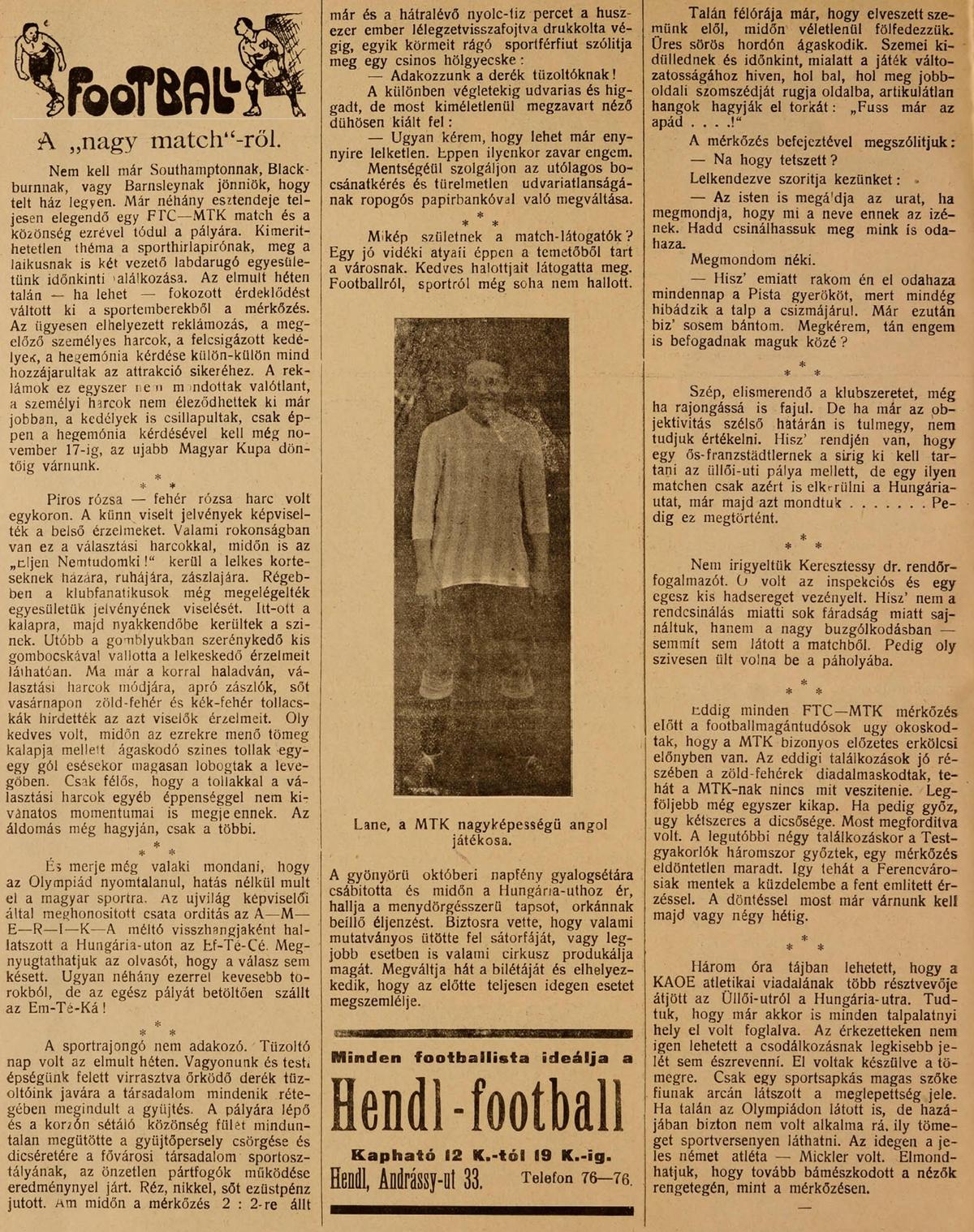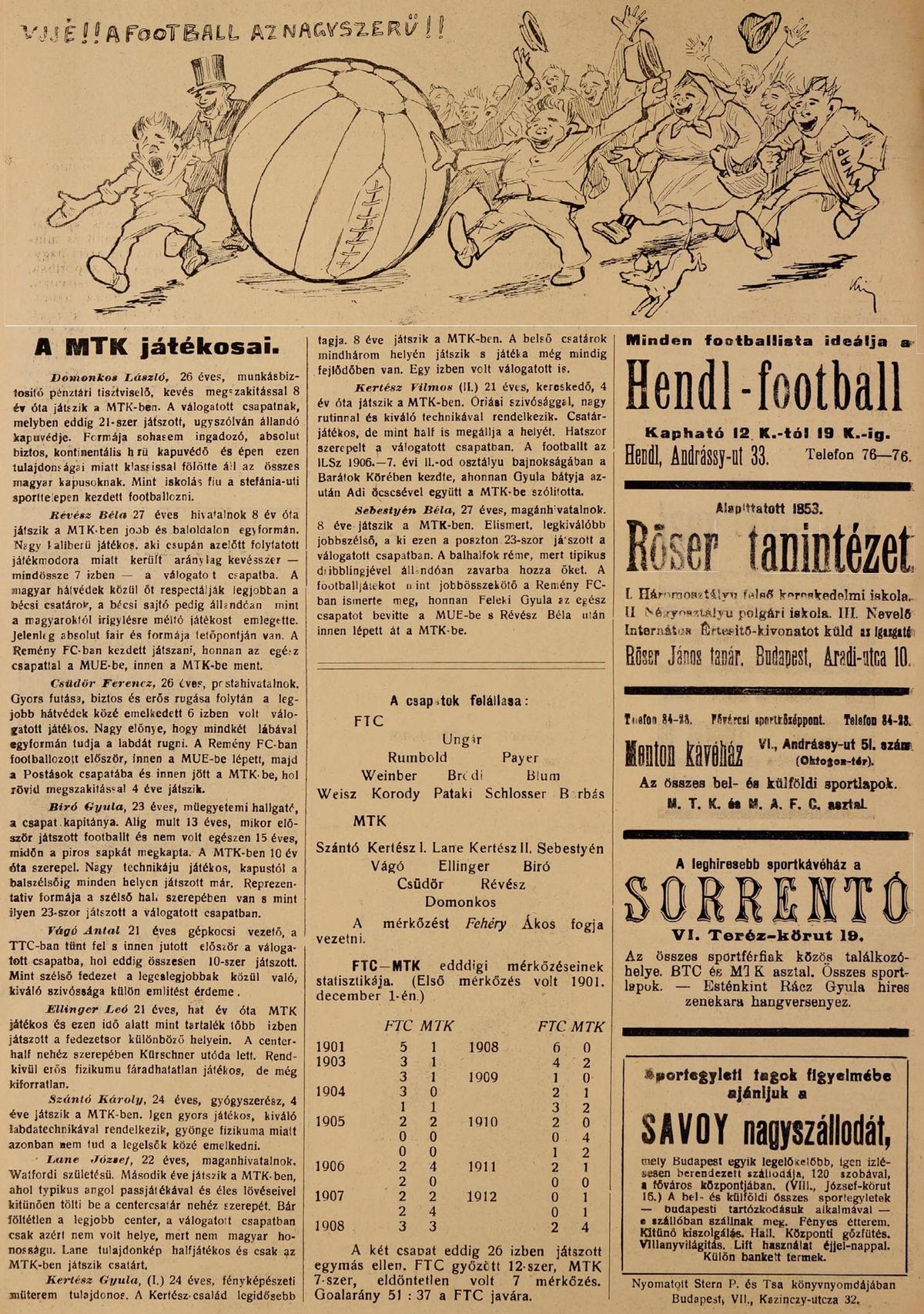 Több mint húszezer néző előtt folyt le vasárnap a Hungária-uti pályán a football sportbeli hegemóniáért a küzdelem a FTC és MTK között. A mérkőzés nem hozott gólokban kifejezhető döntést egyelőre csak az dőlt el, hogy még mindig a FTC a nagyobb technikával rendelkező, jobb formában levő és legnépszerűbb csapat.