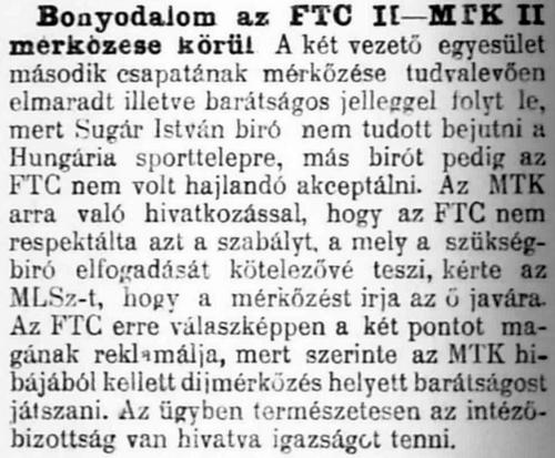 A vasárnapi MTK II.—FTC II. szövetségi dijmérkőzésre az MTK nem küldött a választott bírónak, Sugárnak jegyet, kit — noha kellőkép igazolta magát — nem bocsájtottak jegy nélkül pályára. Sugár sarkon fordult és cserben hagyta az intézőket, kik nem tudván megegyezni a jelen levő szükség bírók közt, a mérkőzést Szüsz Hugó bíráskodása mellett barátságos jelleggel játszották le