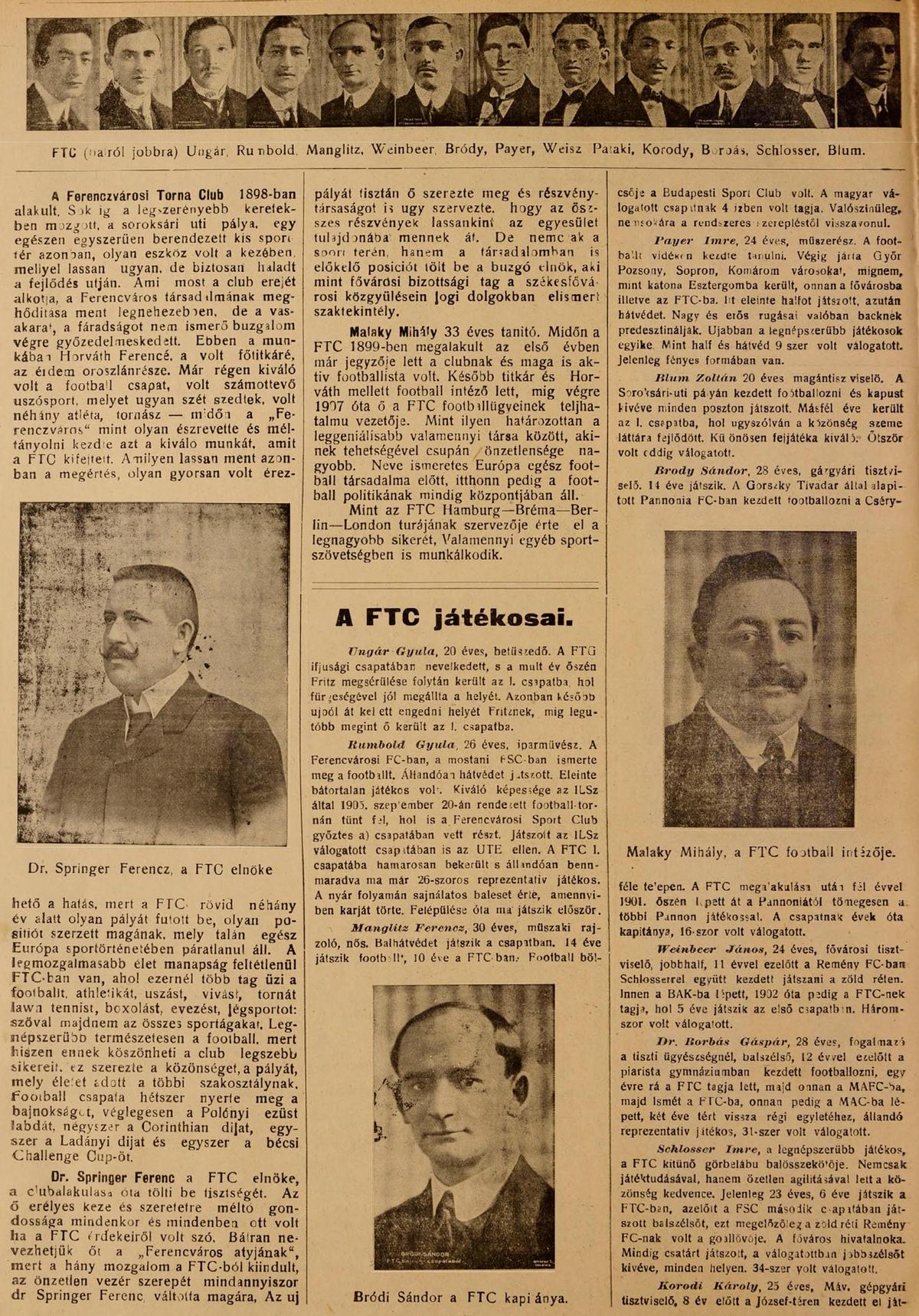 FTC: Ungár — Rumbold, Payer — Weinber, Bródy, Blum — Weisz F., Koródy, Pataky, Schlosser, Borbás dr.