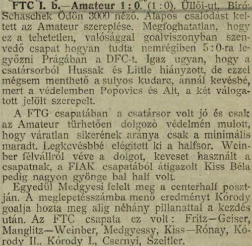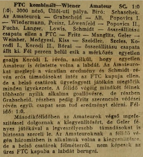 Az Amatőrök mérkőzése. Az üllői-uti versenypályán vasárnap a bécsi Amatőrök a Ferencvárosi Torna-Klub I. b. csapatával mérkőznek. A bécsi csapat, a mely az egykor hírneves Kriketterek csapatából alakult, az osztrák bajnokság negyedik helyén áll. Ezt különben az is igazolja, hogy három játékosa szerepel az osztrák válogatott csapatban. A F. T. K. csapata a következő összeállításban áll ki a mérkőzésre: Ungár—Geiser, Manglitz—Weinber, Medgyessy, Kiss—Rónay, Blum II. (szerk: ekkor már a Szegedi AC játékosa volt), Koródy, Cserny, Szeitler. A magyar-osztrák klubközi mérkőzést megelőzően, félhárom órakor a B. A. K. és a Tatabányai S. K. küzd a Magyar Kupáért.