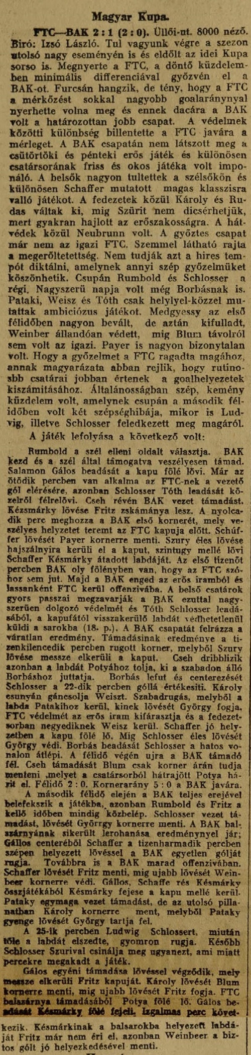 A döntő mérkőzés elején a BAK támadott többet, de ettől függetlenül a Fradi lőtte a gólokat. Góljainkat olyanok szerezték akik még ennyi év távlatából is ismertek. Ha megemlítjük Schlosser és Tóth-Potya nevét, talán még a nem Fradi hívők is tudják, kikről van szó.