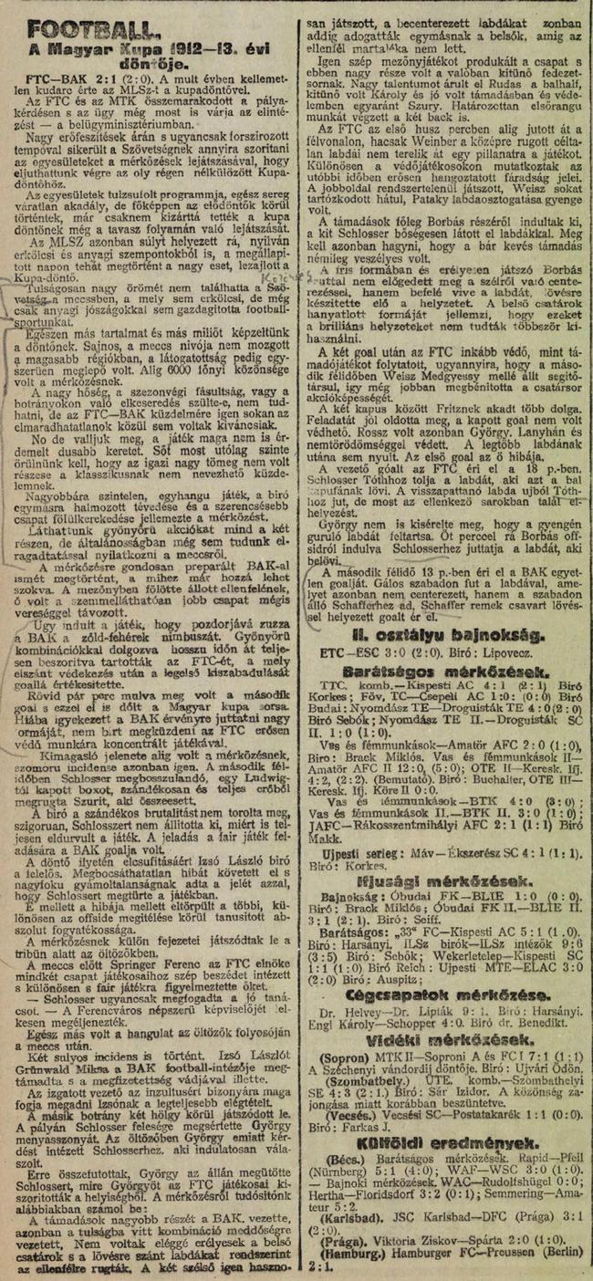 *Budapesti Hírlap, 1913. június 3. „Öt órára tűzték ki a döntőmérkőzést (…) hat óra előtt tiz perccel a döntő mérkőzés szereplői megjelentek a pályán.”