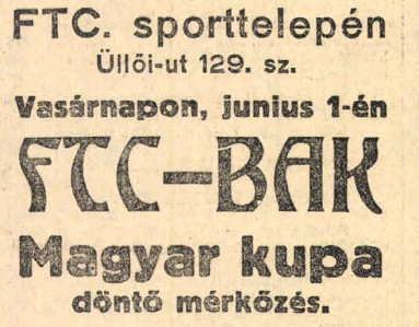 1913. június 1., *17:50, Üllői út, FTC – BAK 2:1 (2:0)