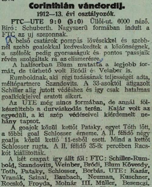 1913. augusztus 24., 16:00, Üllői út, FTC – UTE 9:0 (5:0)