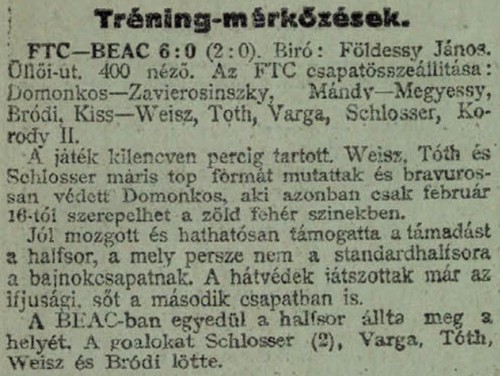 1914.II.1. FTC – BEAC 6:0 (edzőmérkőzés)