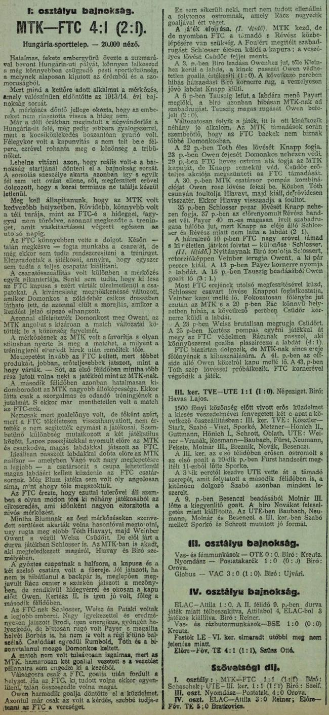 Szövetségi dijmérkőzések. (I. osztály.) FTC—MTK 1:1 (1:1). A MTK goalját Konrád II. rúgta; a FTC 11-esből (Szeitler) kiegyenlített. A MTK-ban Patrovics, a FTC-ban Kiss jó formát mutatott. Biró: Schaschek Ö. (BTC).