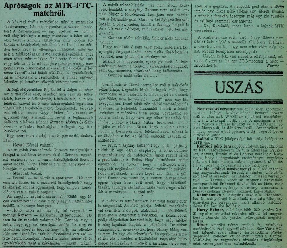 Az FTC tréningje. Csöndben, de annál nagyobb kedvvel és lelkesedéssel treníroz a bajnokcsapat a jövő vasárnapi találkozóra. Minden nap van tréning az üllői-uti pályán és minden nap megjelennek a játékosok futnak és centerezést, kornert, góllövést gyakorolnak. Az egykapura való játékot rendes mérkőzéssel szokták befejezni, máris kiváló formát árulva el. Egy ilyen tréningen megjelent Holmes mester, az MTK angol trénere is. Gannon mester társaságában figyelte a bainokcsapat mozgását s jó húsz percig állt mozdulatlanul, kurta angol pipával a fogai között. Közben Paver megunta hátul a tétlenséget s centercsatárnak léptette elő magát. A mig a labdabadásban remekelt, bodor füstfelhő tódult ki Holmes pipájából s nem mutatkozott semmi különösebb hatás az ellenfél trénerén. De mikor Tóth megszánta a jeles centert s alkalmat adott neki néhány „ágyulövésre”, nagy érdeklődéssel fordult Holmes Gannonhoz: