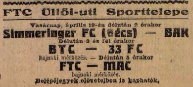 1914. április 19., 17:00, Üllői út, FTC – MAC 2:3 (2:1)