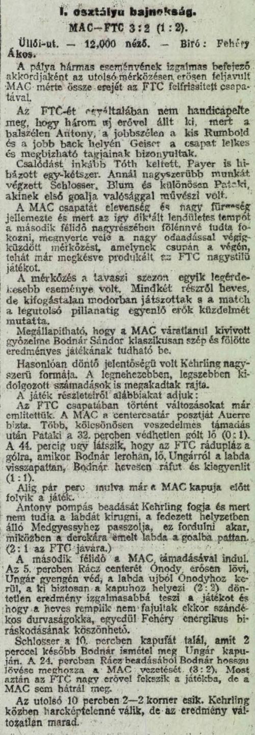 Maga. a FTC-ra. balul végződött mérkőzés a legszebbek sorába tartozott, mert heves küzdelem folyt a győzelemért és mert egyenlően jók voltak a csapatok. A MAC csapata valamivel egységesebb volt, néhány játékosa (Bodnár Sándor, Kehrling, Ocskay) bravúrosan játszott, de mindez nem lett volna elégséges a győzelem kivívásához, ha a szerencse nem pártol, melléje.