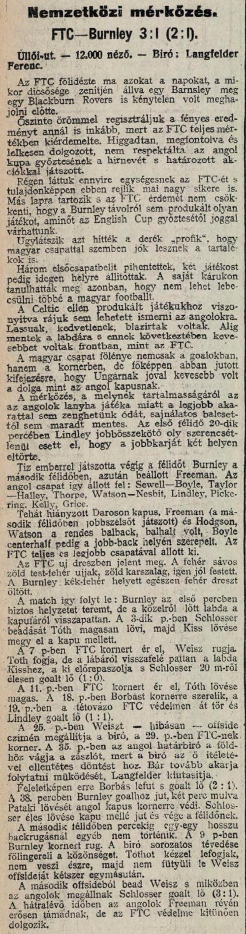 Az üllői-uti versenypályán lefolyt mérkőzésben az „English Cup“ győztese alaposan megtréfálta a mintegy 12.000 főnyi közönséget. Lassú volt, kedvetlen volt s még trükkök bemutatására sem volt kedve. A Burnley igy állt föl: Sewell—Boyle, Taylor—Halley, Thorpe, Watson—Nesbit, Lindley, Pickering, Kelly, Grice. Hiányzott tehát Dawson kapus, Freeman és Hodgson, mig Watson balhátvédő halfot, Boyle centerhalf pedig hátvédőt játszott. A fölforgatás természetesen nem használt a csapatnak, a melynek más baja is támadt. Lindley balösszekötő a 20-dik percben elesett és a jobbkarját két helyen eltörte. Helyébe Freeman állt be a második félidőben jobbszélsőnek. A FTC csapata nagyszerűen játszott. Különösen a védelme dolgozott félelmetes biztossággal, de kitett magáért Kiss centerhalf, Blum balhalf, Pataki center és a már teljesen egészséges Schlosser is. A vezető gólt a FTC szerezte meg már a 7-dik percben. Korner után Schlosser a hozzá tolt labdát élesen az angol kapuba lőtte. A Burnley csak a 19-dik percben egyenlített ki Lindley áttörése és helyezett lövése révén. A 36-dik percben újra a FTC-é lelt a vezetés. Borbás lefutott és gólt lőtt. A második félidőben is a FTC támadott többet, de csak egy gólt tudott csinálni. Az offside helyzetben levő Weisz centrezett labdáját Schlosser a kapuba továbbította, miután a Burnley védelme meg sem kísérelte a védekezést.