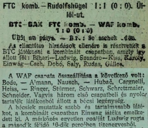 BAK—BTC—FTC kombinált—WAC—WAF kombinált 1:0 (0:0). A két csapat igy állt föl: A bécsi csapat: Bode (WAF)—Axmann (WAF), Nausch (WAC)—Hubac, Gargnelli, Heiss (WAF) —Ringer, Stürmer (WAC), Schwarz (WAF), Schretzmeyer, Schneider (WAC). A magyar csapat: Bihari—Ludwig, Szendrő—Kiss, Károly, Einwag— Gállos, Rudas, Saly, Dobó, Cseh. A mérkőzés unalmas lefolyású volt, mert sem a bécsi, sem a magyar csapat játékosai nem értették meg egymást. Rendszertélen támadások töltötték ki tehát az időt. A győztes gólt Ludwig lőtte tizenegyesből. Biró Schaschek Ödön volt.