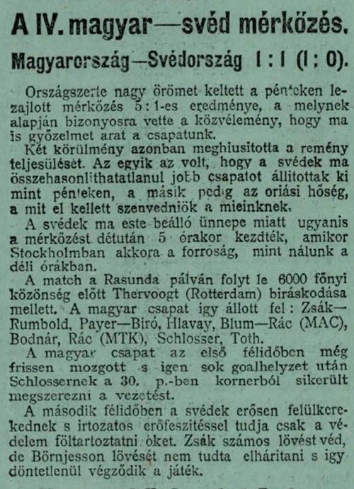 A legerősebb volt tehát a fölállítás, de legjobb legénységét állította ki a svéd szövetség is, csak a svéd csapat megjelenésekor tűnt ki, hogy mindössze két játékos szerepel a pénteki csapatból. A magyarok, az első félidőben erősen szorongatták a svédek kapuját s a harminckettedik percben Schlosser kornerből folyóan a gólba fejeselte a labdát. Ezután a svédek nyomultak előtérbe s gyors és energikus játékukká! alaposan kimentették a tikkasztó hőségtől amúgy is bágyadt magyar fiukat.