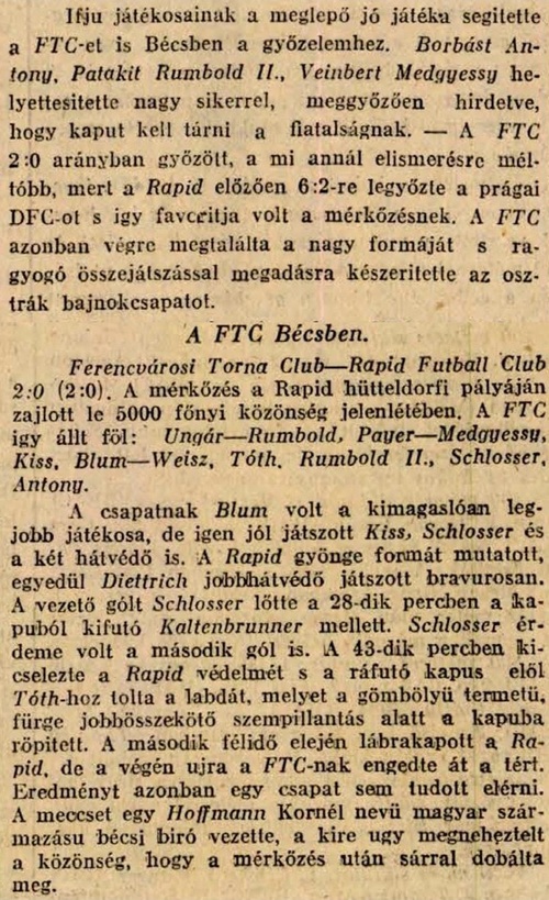 FTC: Ungár — Rumbold, Payer — Medgyessy, Kiss B., Blum — Weisz F., Tóth-Potya, Rumbold II., Schlosser, Antony