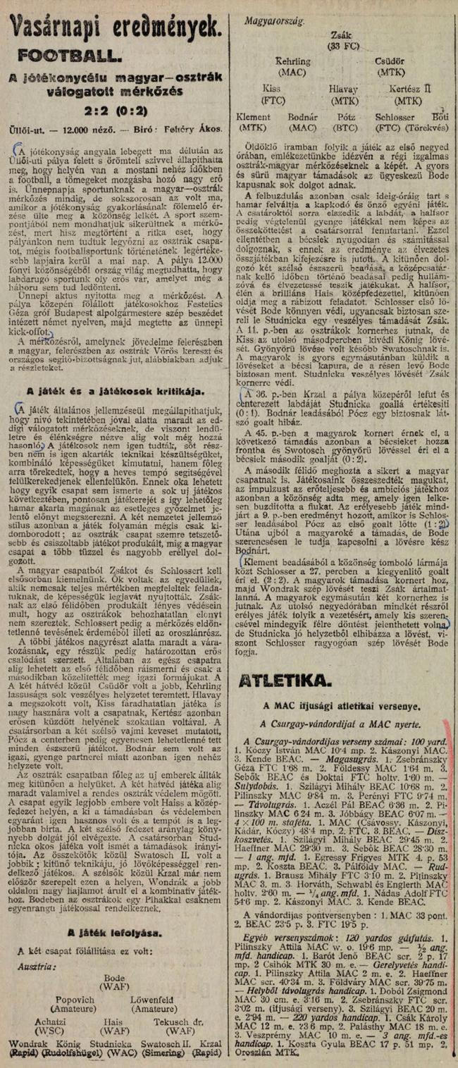 A magyar csapat győzelmében bizunk, az osztrák csapat jóságának elismerése mellett is. Csapatunk elismert régi, kitűnő játékosokból áll s két uj ember (Kehrling, MAC és Bőti, Törekvés) beállítása is egyhangú helyesléssel találkozott. Tóth beállítása a jobbszélre a pillanatnyi formák szerint szintén szerencsés volt. Pataki ugyan a centerben nem játszhat betegsége miatt, de Póczban a válogatók jó helyettest találtak, akinek nagy technikája Bodnár és Schlosser közt előnyösen fog érvényesülni.