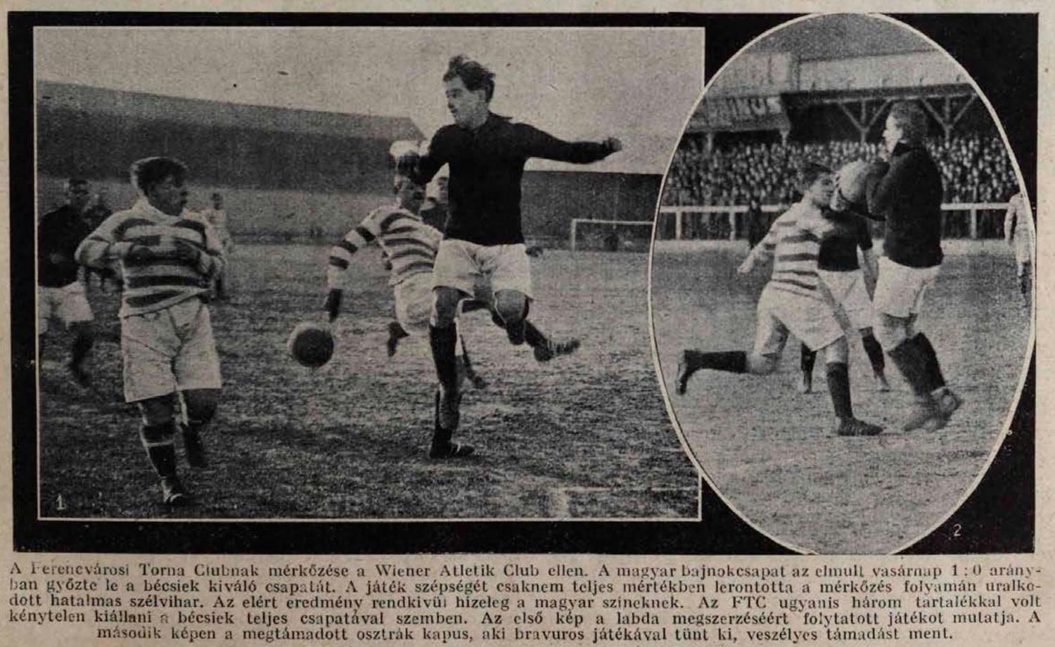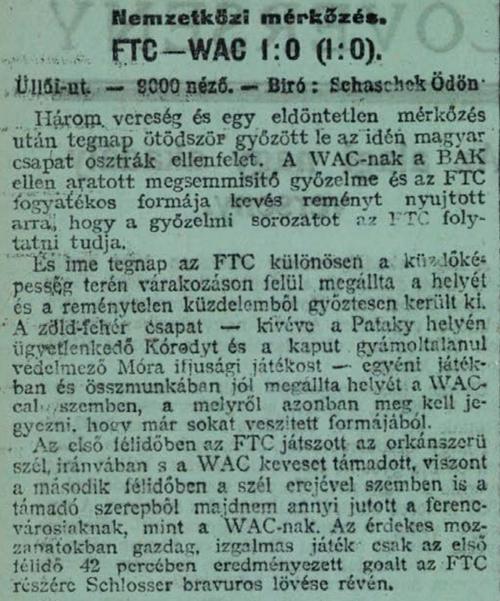 (…) Örömteljes eseménye mégis volt a széldulta vasárnapnak. A FTC csapata impozáns támadó, majd védőjátékot folytatva, 1:0 arányban legyőzte a Bécs első klasszisába tartozó Wiener Atletiksport Club csapatát. Pedig a magyar bajnokcsapat súlyosan hendikepelve állt a porondra. Pataki, a legjobb magyar center helyett a már kiérdemesült Koródy játszott s Fritz helyét egy még ifjúsági játékos foglalta el a kapuban, persze kénytelenségből, sokszor tartva rettegésben a közönséget gyönge helyezkedése és még gyöngébb labdafogása miatt. Szerencsére a Rumbold-Payer hátvédő pár mindig idejében szétrombolta a bécsi csatázósor támadó akcióját s így az ifjú kapusnak nem kellett lövést védenie, különben bizonyosan más eredményről kellene beszámolni. Ez a meccs különben időnkint eléggé tetszetős volt, mert a WAC csatázók megvesztegetően szép összjátékkal nyomultak föl, igen gyakran, a FTC kapujához s mert a FTC csatázósor a második félidőben kamatos kamattal fizetett érte. Ekkor ugyanis a FTC játszott a szél ellen s mintha hatott volna rá a bécsiek példája, szintén sok heves rohamot intézett a bécsi kapu ellen, — ha egyébként eredménytelenül is. A FTC különben megérdemelte az értékes győzelmet, mert sokkal állóképesebbnek bizonyult ellenfelénél, a mi pedig megbecsülhetetlen erény a futballban.