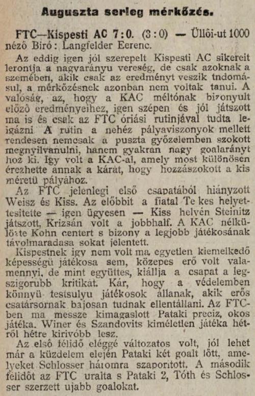 FTK—Kispesti AK 7:0 (3:0). Üllőí-uti pálya. 1600 néző. A Ferencvárosi Torna Klub csapatából Weisz és Kiss hiányoztak. Helyetteseik Medgyesi és Kovács meglepően jól játszottak. Az FTK teljes csatársora kitűnő formában volt. Az egész match ideje alatt a Kispestiek kapuja előtt voltak a zöld-fehérek. Különösen a balszárny tünt ki Schlossert és Borbást régen láttuk olyan eredményesen játszani, mint ma. Pataki volt a támadások vezetője. Egymaga négy goalt rúgott. Schlosser kettőt, az utolsó goal pedig Tóth érdeme. A Kispestiek teljes csapata nem bírta az FTK gyors tempóját és állandóan védekezésre szorult. A közvetlen védelemben különösen Kónya játszott önfeláldozóan. Jó bíró volt Langfelder Ferenc.