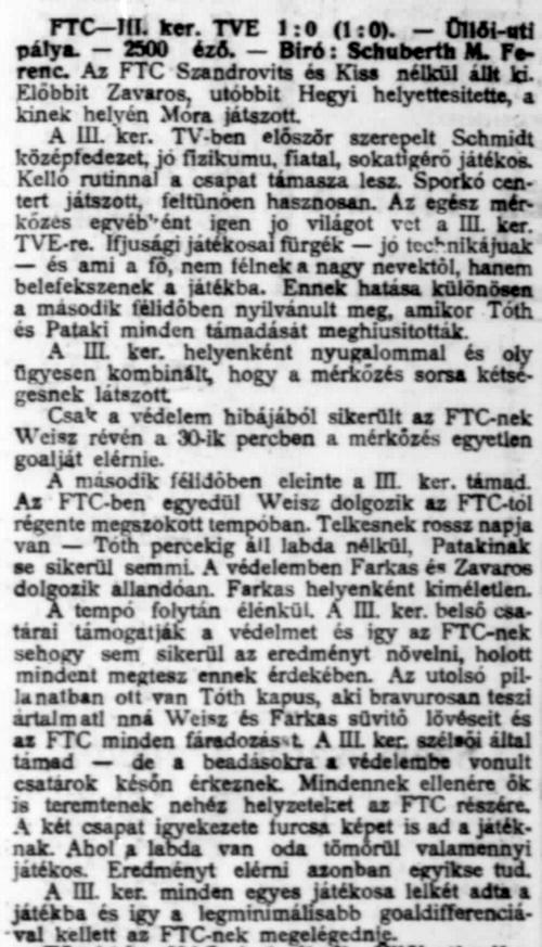 FTC: Magyar — Wiener, Zavaros — Móra, Hegyi, Farkas — Telkes, Weisz F., Pataky, Tóth-Potya, Molnár