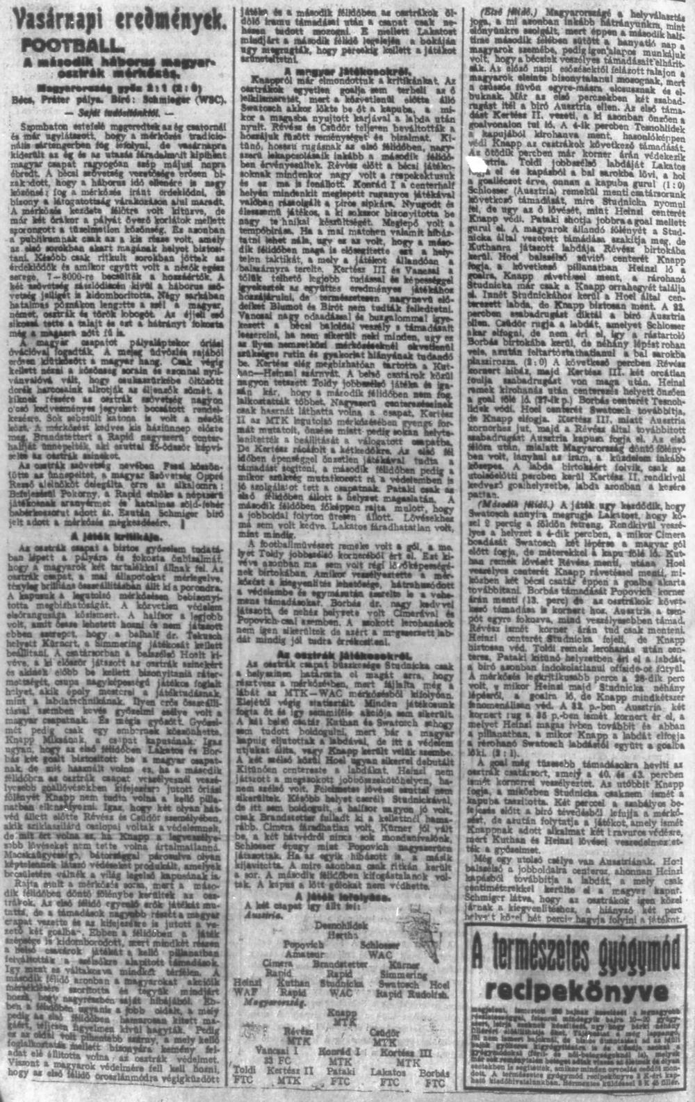 Az osztrák válogatott csapat így fog fölállani: Tesnohlidek (Herta) — Popovich (Amatőr), Schlosser (WAC) — Cimera (Rapid), Brandstetter (Rapid), Tekusch dr. (WAF) — Heinzl (WAF), Kuthan (Rapid), Szudnicka (WAC), Svatosh (Rapid) és Hoel (Rudolfhügel).