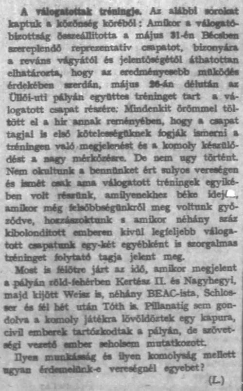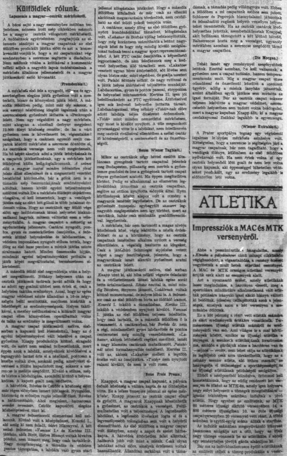 A válogatott csapat elutazása. A Magyar Labdarugó Szövetség válogató bizottsága által kiszemelt válogatott csapat, amelynek összeállítását mai számunkban közöltük, május 29-én, szombaton délután a két órai gyorsvonattal utazik Bécsbe Zsák, Szandovits, Wiener, Vancsai, Kehrling, Kertész III, Schaffer, Weisz és Póc tartalékokkal. A csapatot Minder Frigyes szövetségi kapitány fogja kisérni. Az MLSz a képviselőit a pénteki tanácsülésen fogja megállapítani. A mérkőzés színhelye a Wiener Atletik Klub Práterben levő pályája lesz. A match pontban fél öt órakor fog kezdődni és a csapat még az esti gyorsvonattal hazautazik.