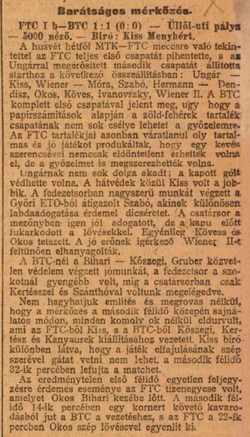Jó napja volt Tóthnak is, aki néhány szép lövést menesztett az MTK kapuára. Pataky még nem a régi, de azért hasznosan játszott. Kétségtelen, az FTC. sokkal jobban mozgott, több lendülettel és hévvel játszott s kis szerencsével megnyerhette volna a mérkőzést.