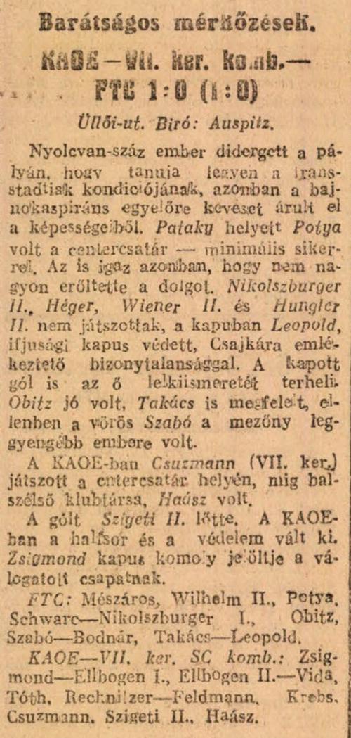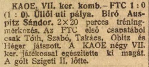 1922.II.19. FTC – KAOE, VII. ker. SC kombinált 0:1 (edzőmérkőzés)
