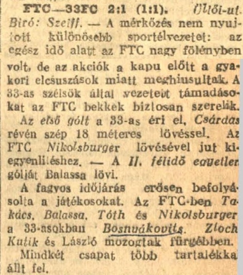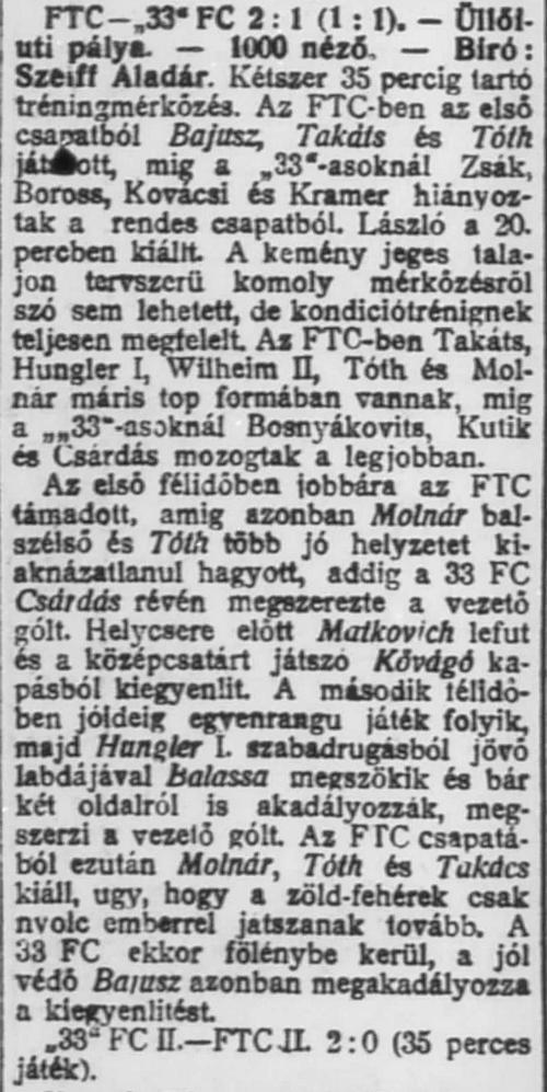 1922.II.5. FTC – 33 FC 2:1 (edzőmérkőzés)