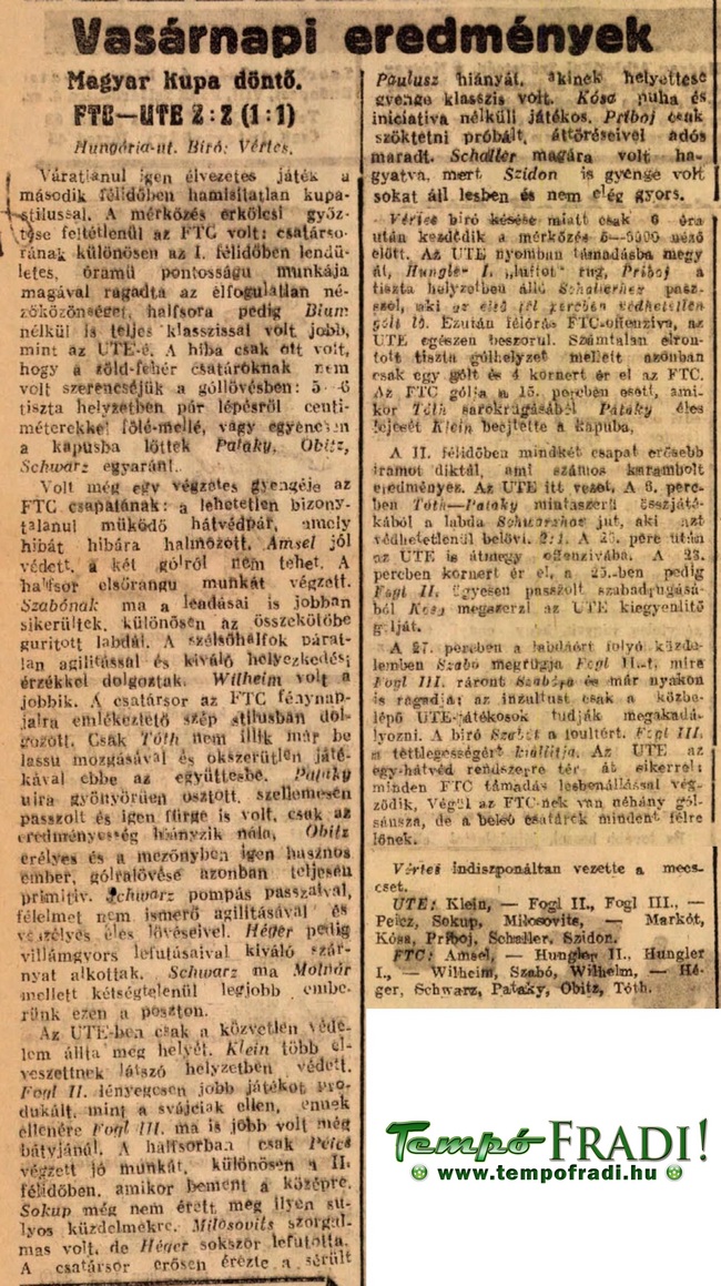 1922.VI.18. MK Döntő, FTC – UTE 2:2 Közzétéve: 2009. január 22. csütörtök | Szerző: mjozef22 Nem dőlt el a Magyar Kupa sorsa Egy hozzászólás a(z) 11110000010ejegyzéshez Elvarratlan on 2009. június 27. szombat - 11:46 Szenzációsak ezek a régi újságok, ugyanakkor végtelenül szomorú, hogy míg 1922-ben a másodosztályú ligában még ennyi budapesti csapat volt, mára pedig maximum ennyi bevásárló-központ van, mert a pályákat mind lebontották/eltüntették… Vélemény, hozzászólás? Válasz megszakításaAz e-mail címet nem tesszük közzé. A kötelező mezőket * karakterrel jelöltük Hozzászólás * Név * E-mail cím * Honlap Δ