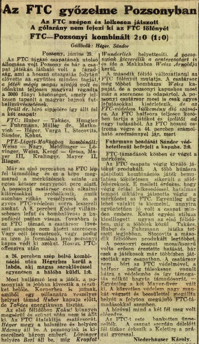 1926.VI.29. Pozsony válogatott – FTC 0:2