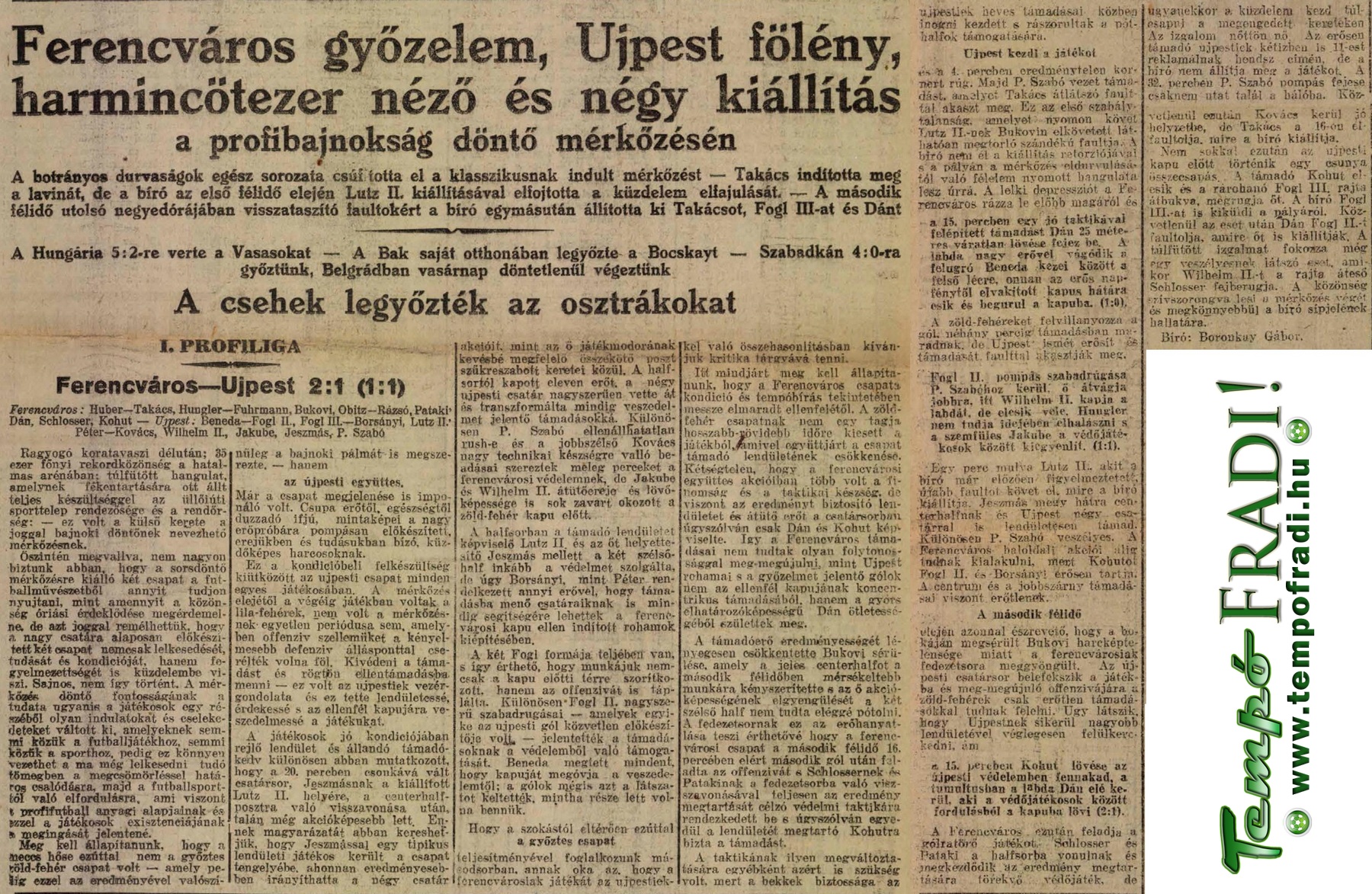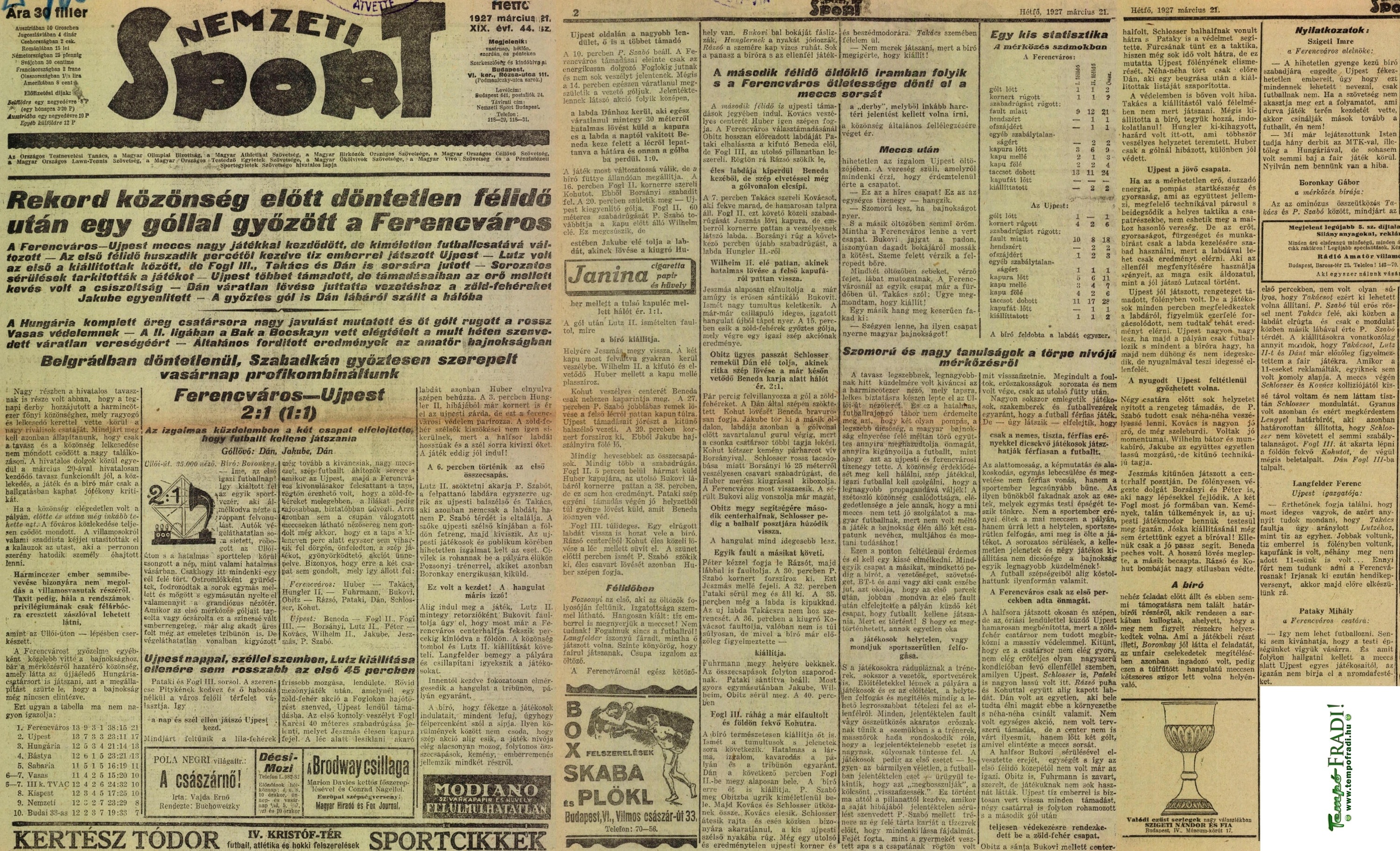 1927.III.20. Ferencváros – Újpest 2:1 Közzétéve: 2009. január 27. kedd | Szerző: K@rcsi Ferencváros győzelem, Újpest fölény, harmincötezer néző és négy kiállítás a profibajnokság döntő mérkőzésén Vélemény, hozzászólás? Válasz megszakításaAz e-mail címet nem tesszük közzé. A kötelező mezőket * karakterrel jelöltük Hozzászólás * Név * E-mail cím * Honlap Δ