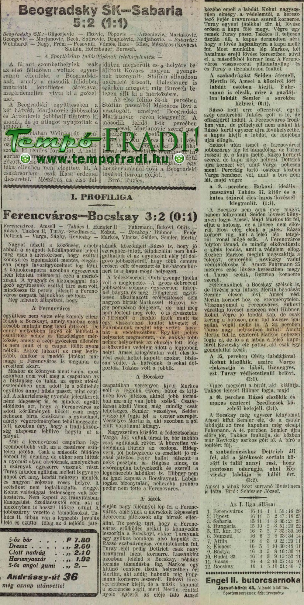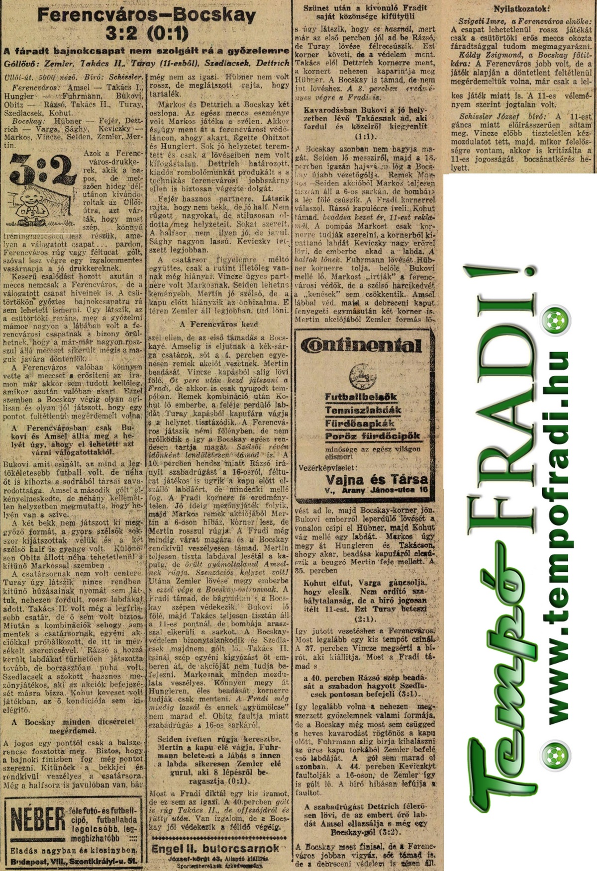 1928.III.18. Ferencváros – Bocskay 3:2 Közzétéve: 2009. január 28. szerda | Szerző: K@rcsi A váratlanul rossz formát mutató Ferencváros csak nehezen boldogult az I. félidőben vezető Bocskayval A bajnoki meccsek során a Ferencvárost majdnem baj érte A fáradt bajnokcsapat nem szolgált rá a győzelemre Vélemény, hozzászólás? Válasz megszakításaAz e-mail címet nem tesszük közzé. A kötelező mezőket * karakterrel jelöltük Hozzászólás * Név * E-mail cím * Honlap Δ