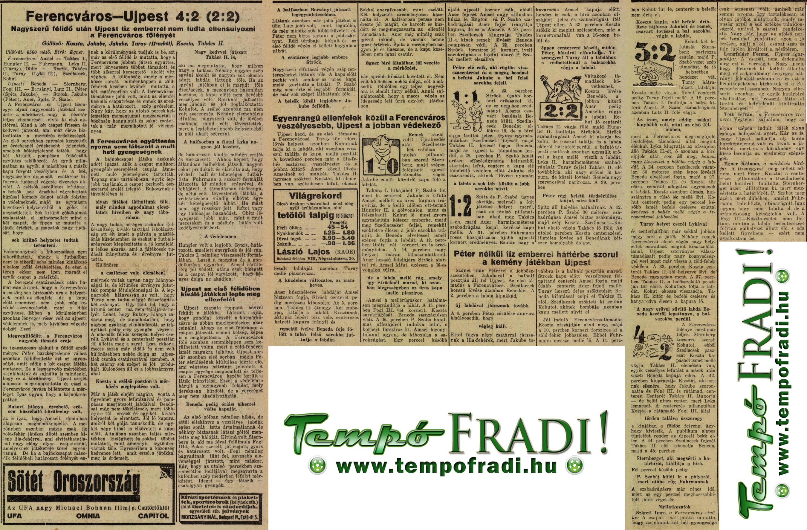 1928.IV.5. Húsvéti serleg, Ferencváros – Újpest 4:2 Közzétéve: 2009. január 28. szerda | Szerző: K@rcsi A Ferencváros tartalékjai pompásan küzdöttek Turay átfejeli a labdát Aknai kapus fölött Amsel öklözi el a labdát P. Szabó elől Vélemény, hozzászólás? Válasz megszakításaAz e-mail címet nem tesszük közzé. A kötelező mezőket * karakterrel jelöltük Hozzászólás * Név * E-mail cím * Honlap Δ
