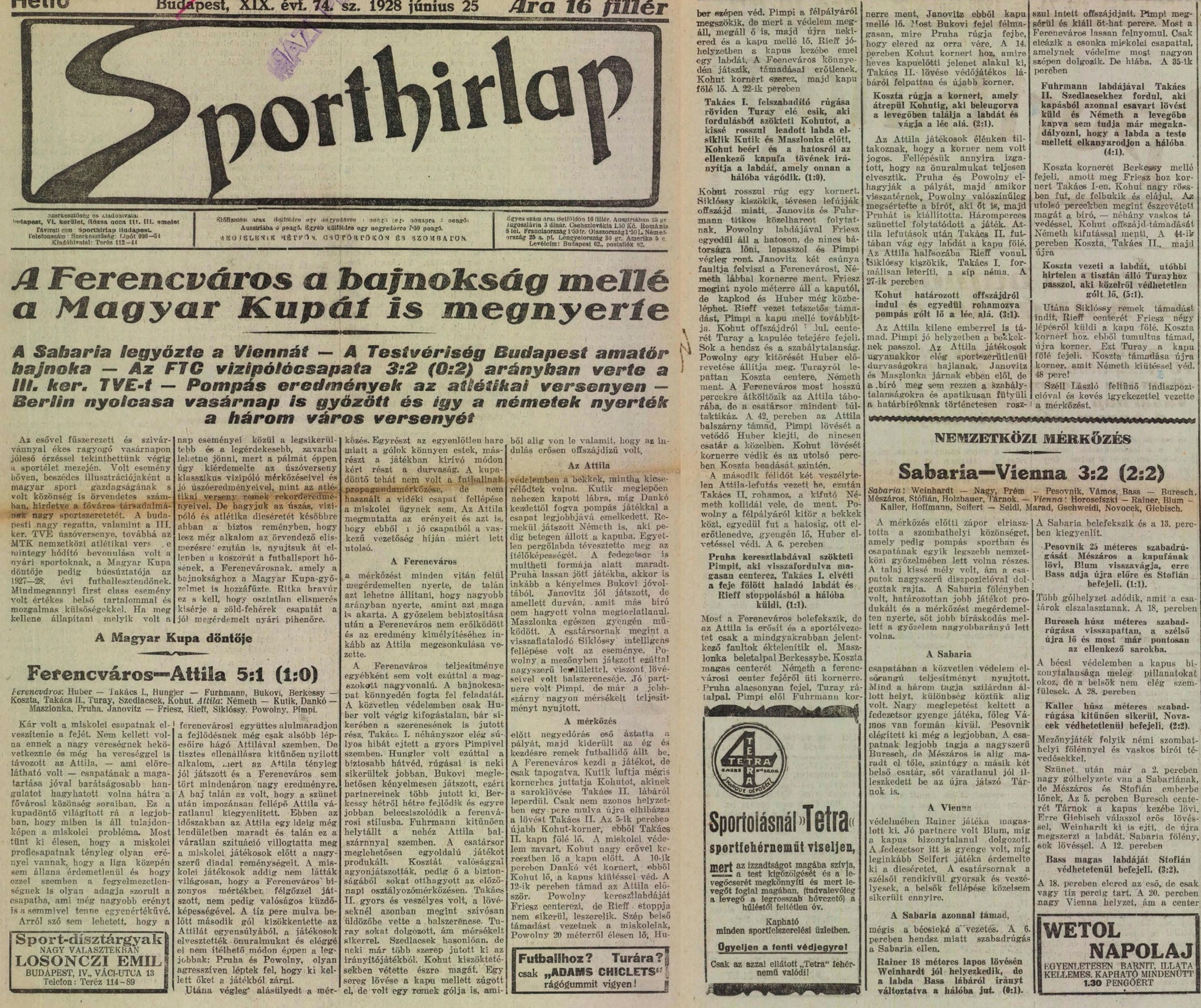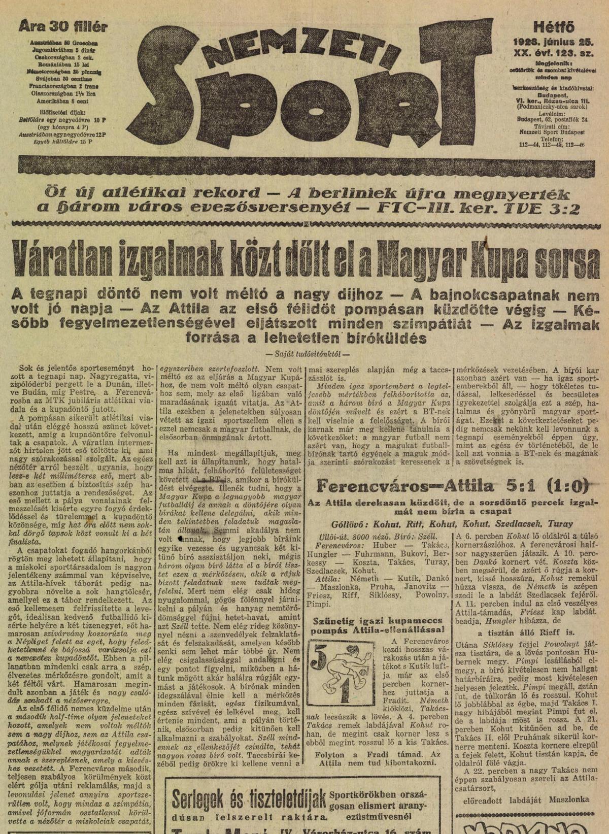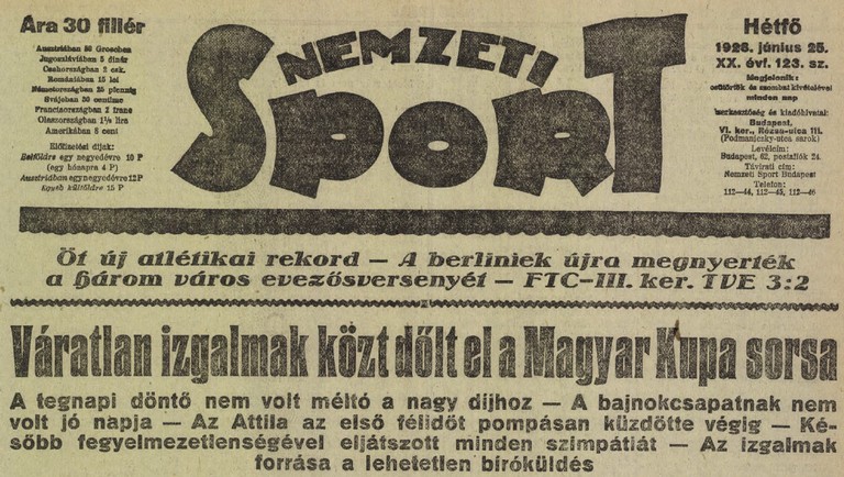Az 1928. június 24.-i magyar kupadöntő két részvevőjéből a Ferencvárost mindenki ismeri, de amikor megláttam a kissé „megviselt” sportújságban az „Attila” nevet, óhatatlanul is először Dragó jutott az eszembe. Elnézést a hasonlatért, saját magam is jót derültem rajta, de számomra teljesen ismeretlen volt az ellenfél. Először egy pesti csapatra gondoltam, de mikor utána néztem a neten akkor szembesültem azzal, hogy az Attila FC a kezdeti miskolci labdarúgás egyik megtestesítője volt a húszas-harmincas években.
