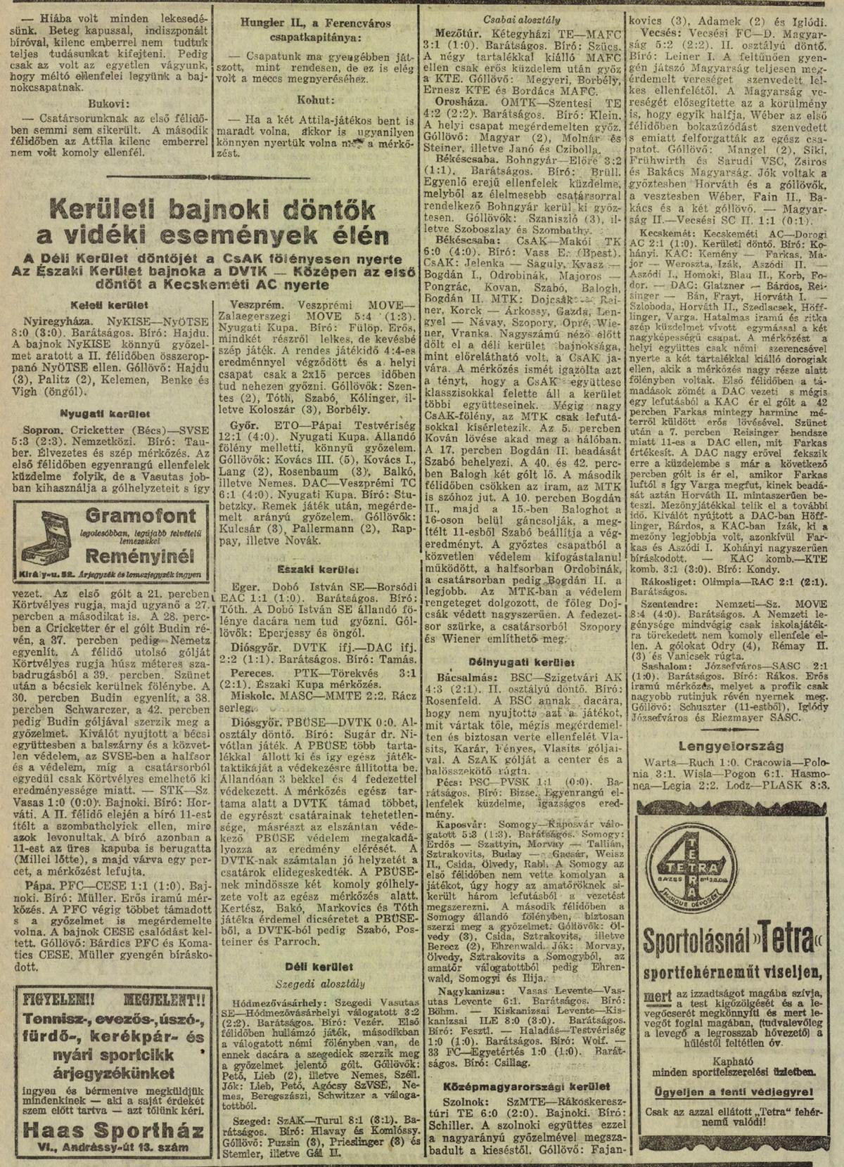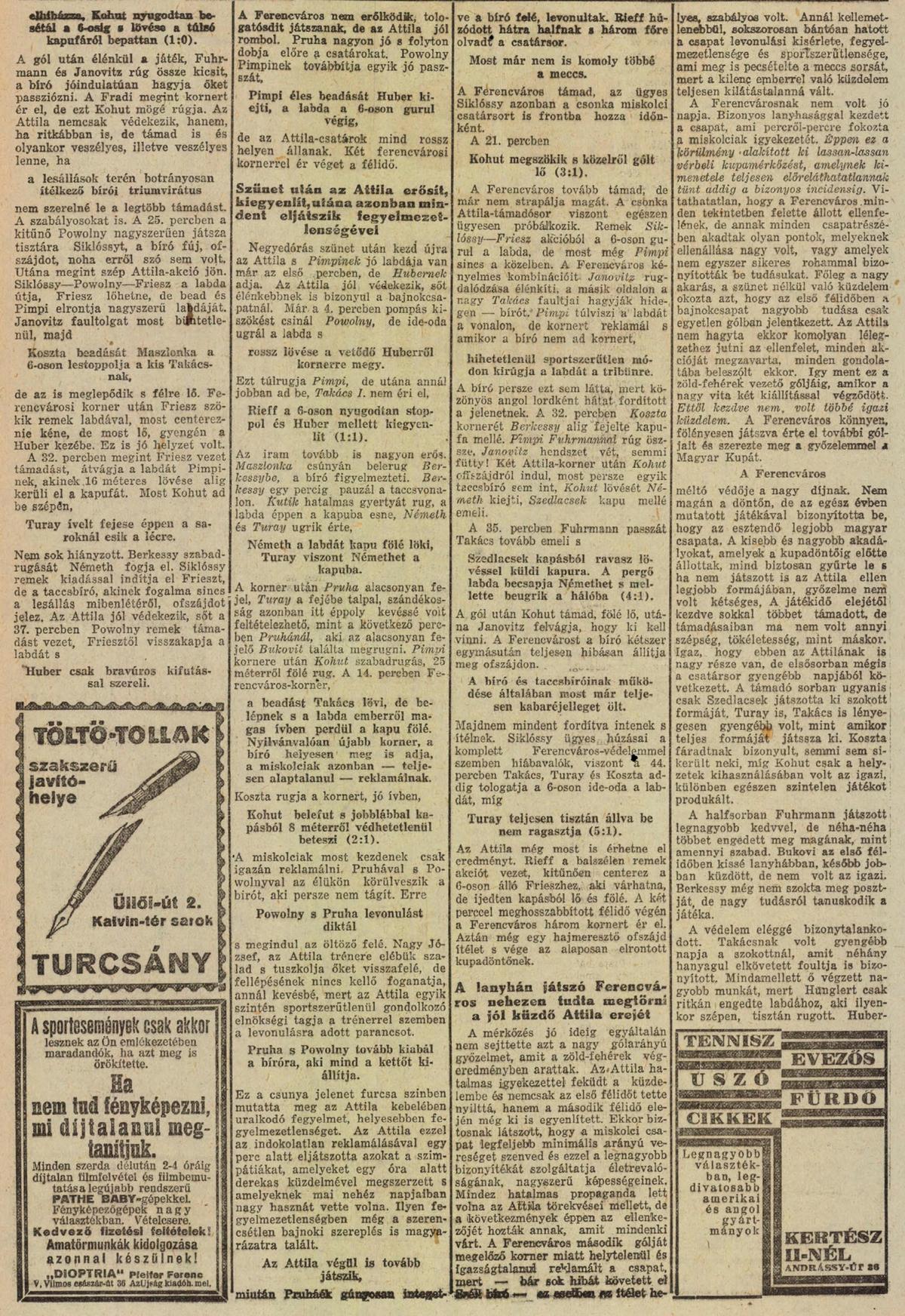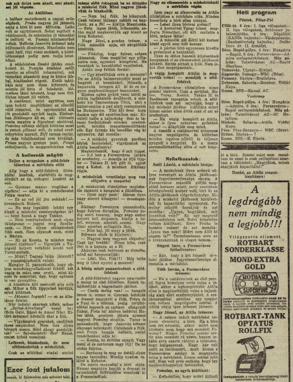 A gól szerencsére felpaprikázta a zöld-fehéreket és a közönség fergeteges biztatása közepette egyre másra vezettük a veszélyes támadásokat. A második gólunk után elszabadultak az indulatok. Az Attila FC játékosai hevesen reklamáltak, mert szerintük a gólunkat megelőző „kornert” a bíró tévesen adta meg. A játékosok heves tiltakozása odáig fajult, hogy egyes játékosok le is akartak vonulni a pályáról, de szerencsére a csapat edzője meg tudta győzni az ideges játékosokat a mérkőzés folytatásáról. Bár a korner jogosságát a miskolciakon kívül senki sem reklamálta, az egész mérkőzésen a bírói hármas nem állt helyzete magaslatán. Ritkán szoktam egy lapszemle során idézni az újságból, hiszen bárki elolvashatja a részletes beszámolót, de mivel egyrészt elég rossz minőségű a több mint nyolcvan éves újság, másrészt a tudósító olyan örök érvényű megállapításokkal „rakta helyre” a bírókat, hogy azokat mindenkinek érdemes elolvasni: