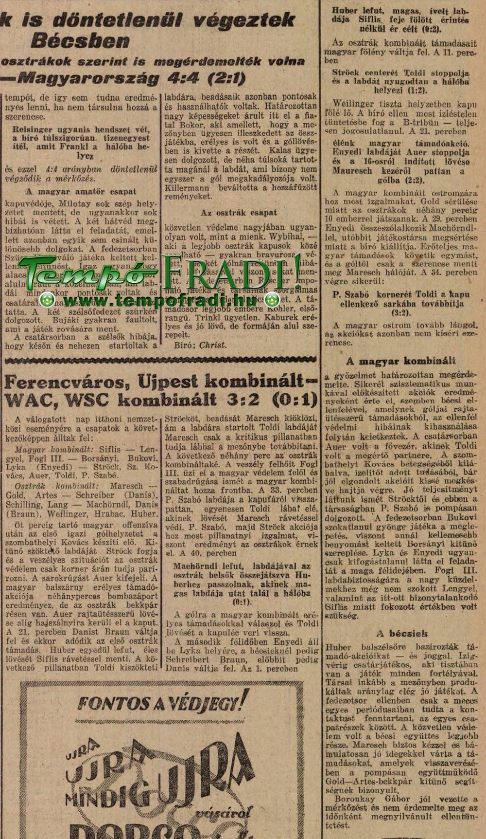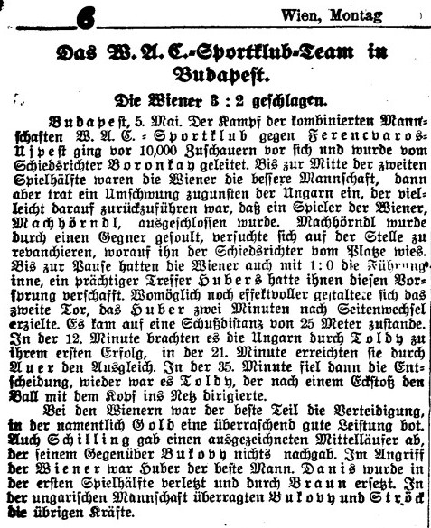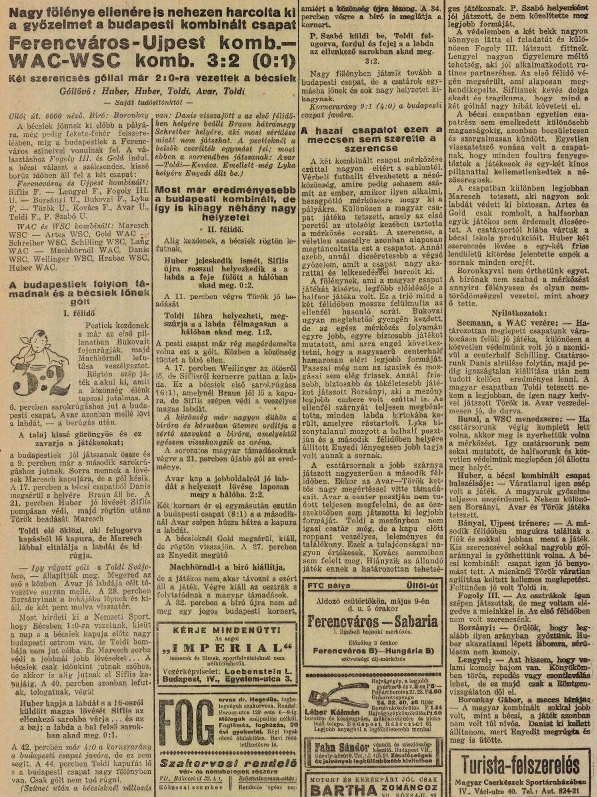 1929.V.5. Ferencváros, Újpest kombinált – WAC, WSC kombinált 3:2 Közzétéve: 2009. január 29. csütörtök | Szerző: K@rcsi Nagy fölénye ellenére is nehezen harcolta ki a győzelmet a budapesti kombinált csapat Vélemény, hozzászólás? Válasz megszakításaAz e-mail címet nem tesszük közzé. A kötelező mezőket * karakterrel jelöltük Hozzászólás * Név * E-mail cím * Honlap Δ