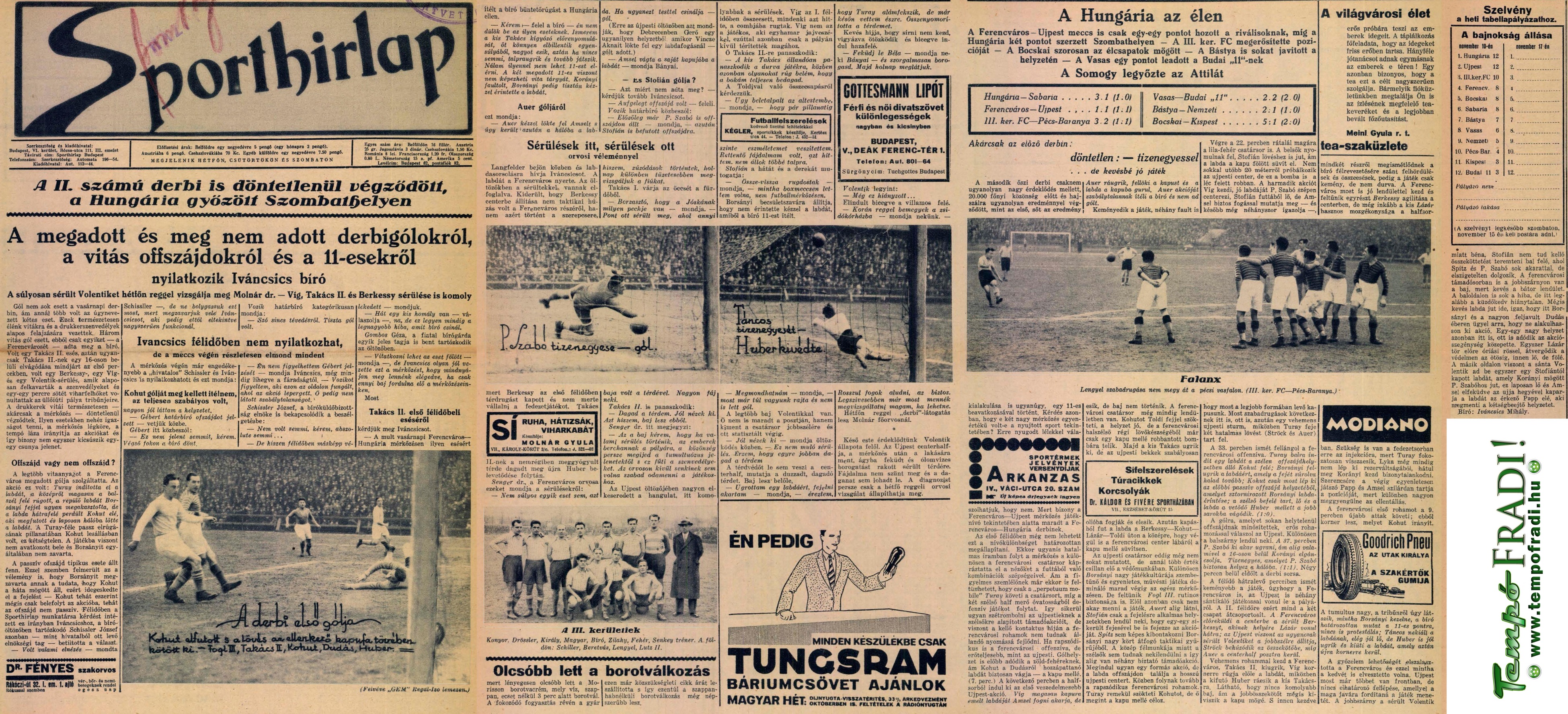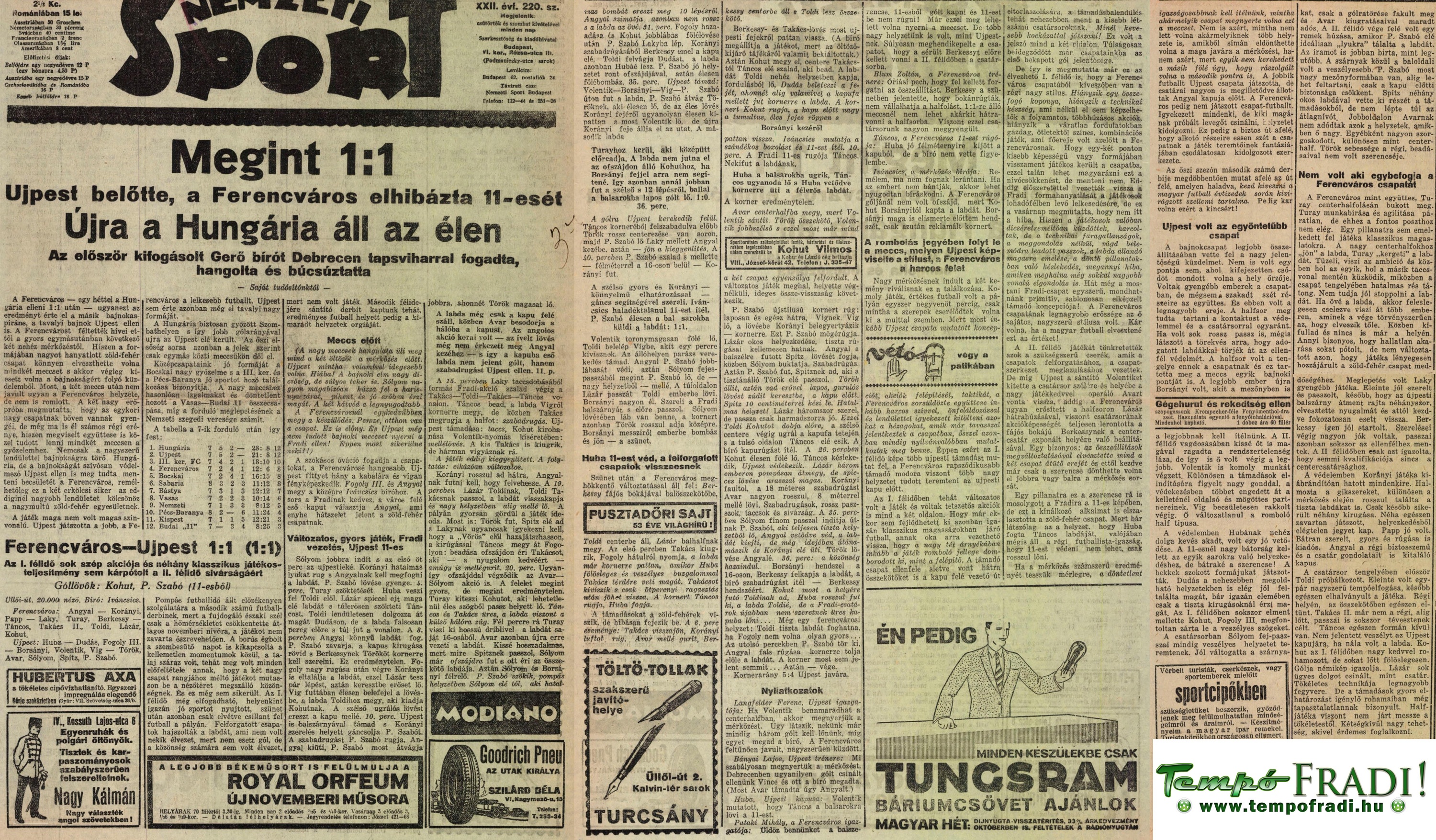 1930.XI.9. Ferencváros – Újpest 1:1 Közzétéve: 2009. január 30. péntek | Szerző: K@rcsi Az I. félidő sok szép akciója és néhány klasszikus játékos-teljesítmény sem kárpótolt a II. félidő sivárságáért Vélemény, hozzászólás? Válasz megszakításaAz e-mail címet nem tesszük közzé. A kötelező mezőket * karakterrel jelöltük Hozzászólás * Név * E-mail cím * Honlap Δ