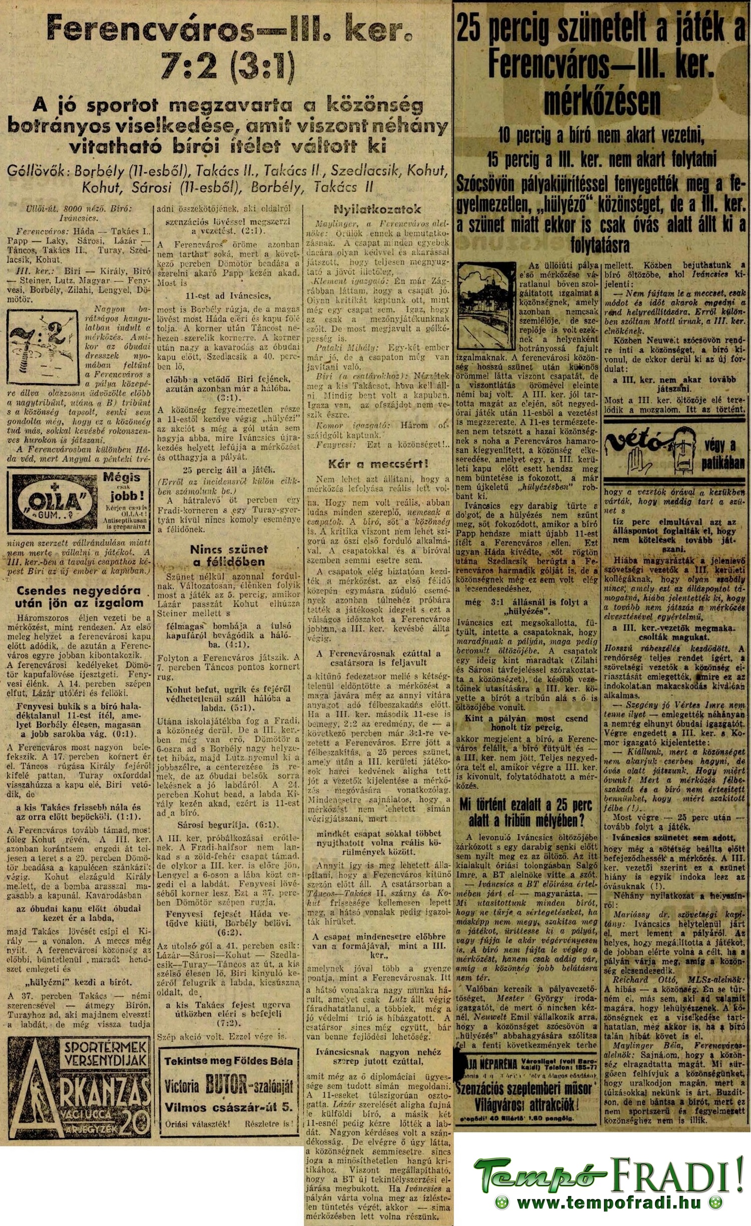 1931.IX.6. Ferencváros – III. ker. FC 7:2 Közzétéve: 2009. január 31. szombat | Szerző: mjozef22 A jó sportot megzavarta a közönség botrányos viselkedése, amit viszont néhány vitatható bírói ítélet váltott ki Vélemény, hozzászólás? Válasz megszakításaAz e-mail címet nem tesszük közzé. A kötelező mezőket * karakterrel jelöltük Hozzászólás * Név * E-mail cím * Honlap Δ