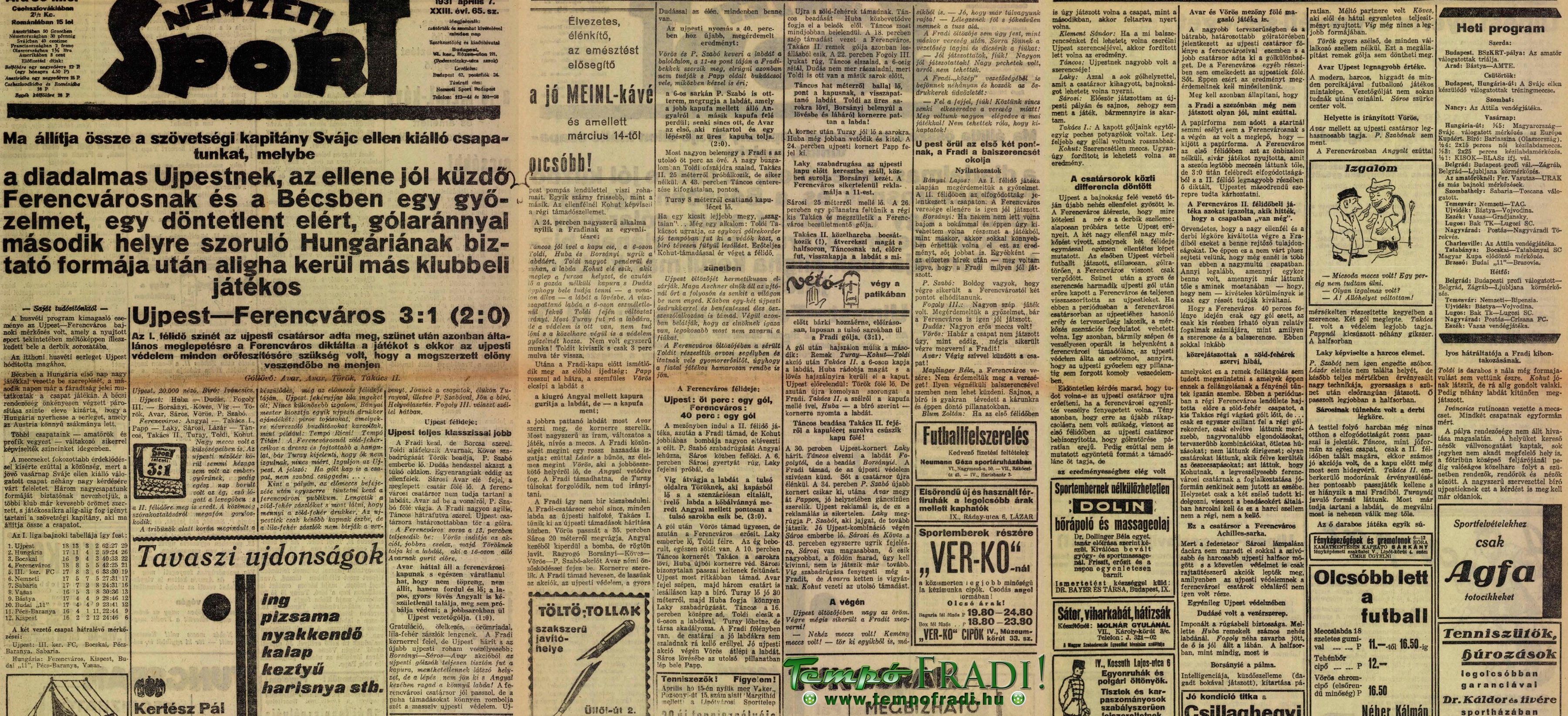 Az I. félidő színét az újpesti csatársor adta meg, szünet után azonban általános meglepetésre a Ferencváros diktálta a játékot s ekkor az újpesti védelem minden erőfeszítésére szükség volt, hogy a megszerzett előny veszendőbe ne menjen