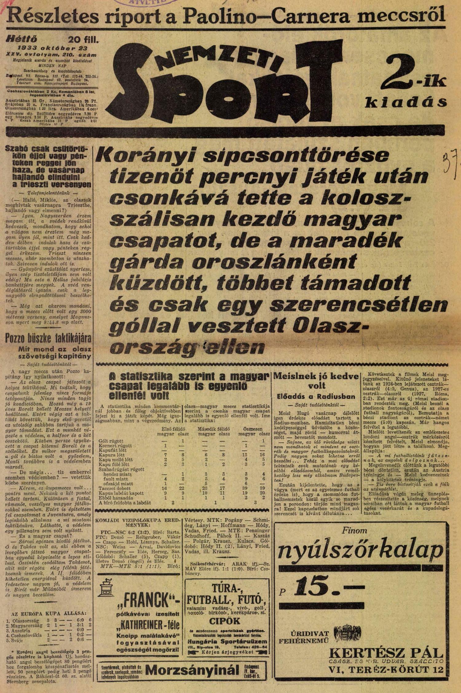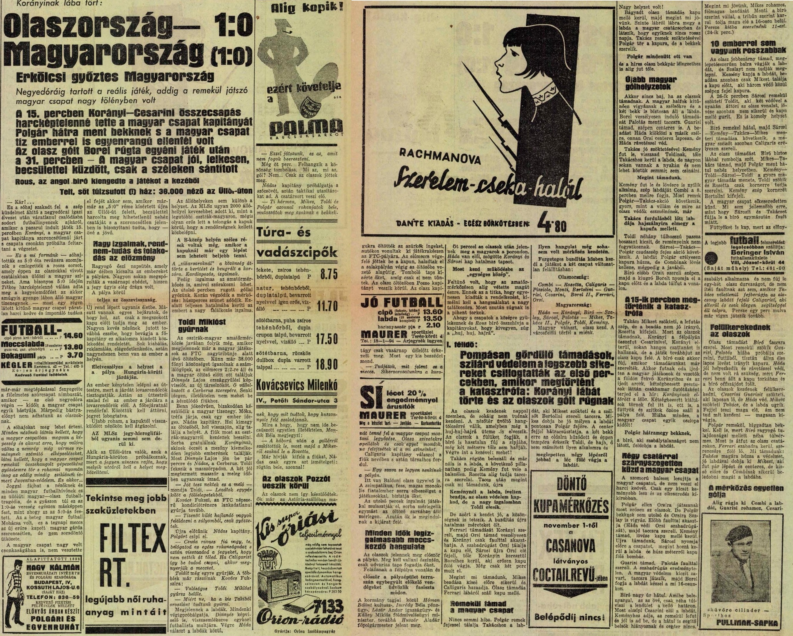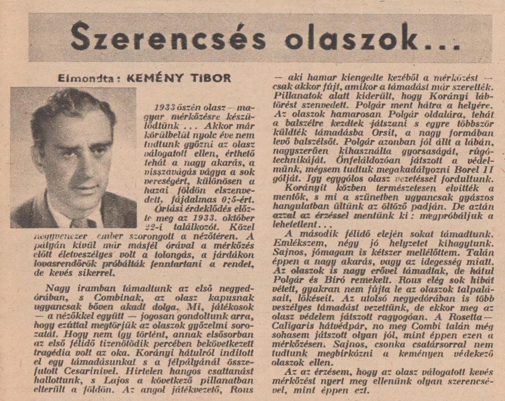 1933. október 22. MAGYARORSZÁG—OLASZORSZÁG 0:1 (0:1)